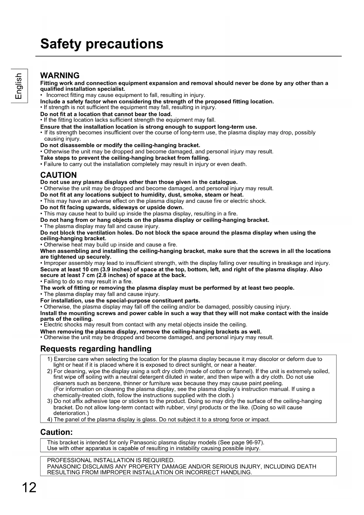 Caution: This bracket is intended for only Panasonic plasma display models (See page 96-97). Use with other apparatus is capable of resulting in instability causing possible injury. PROFESSIONAL INSTALLATION IS REQUIRED. PANASONIC DISCLAIMS ANY PROPERTY DAMAGE AND/OR SERIOUS INJURY, INCLUDING DEATH RESULTING FROM IMPROPER INSTALLATION OR INCORRECT HANDLING.13 English [The images shown in this manual are for illustrative purpose only.]