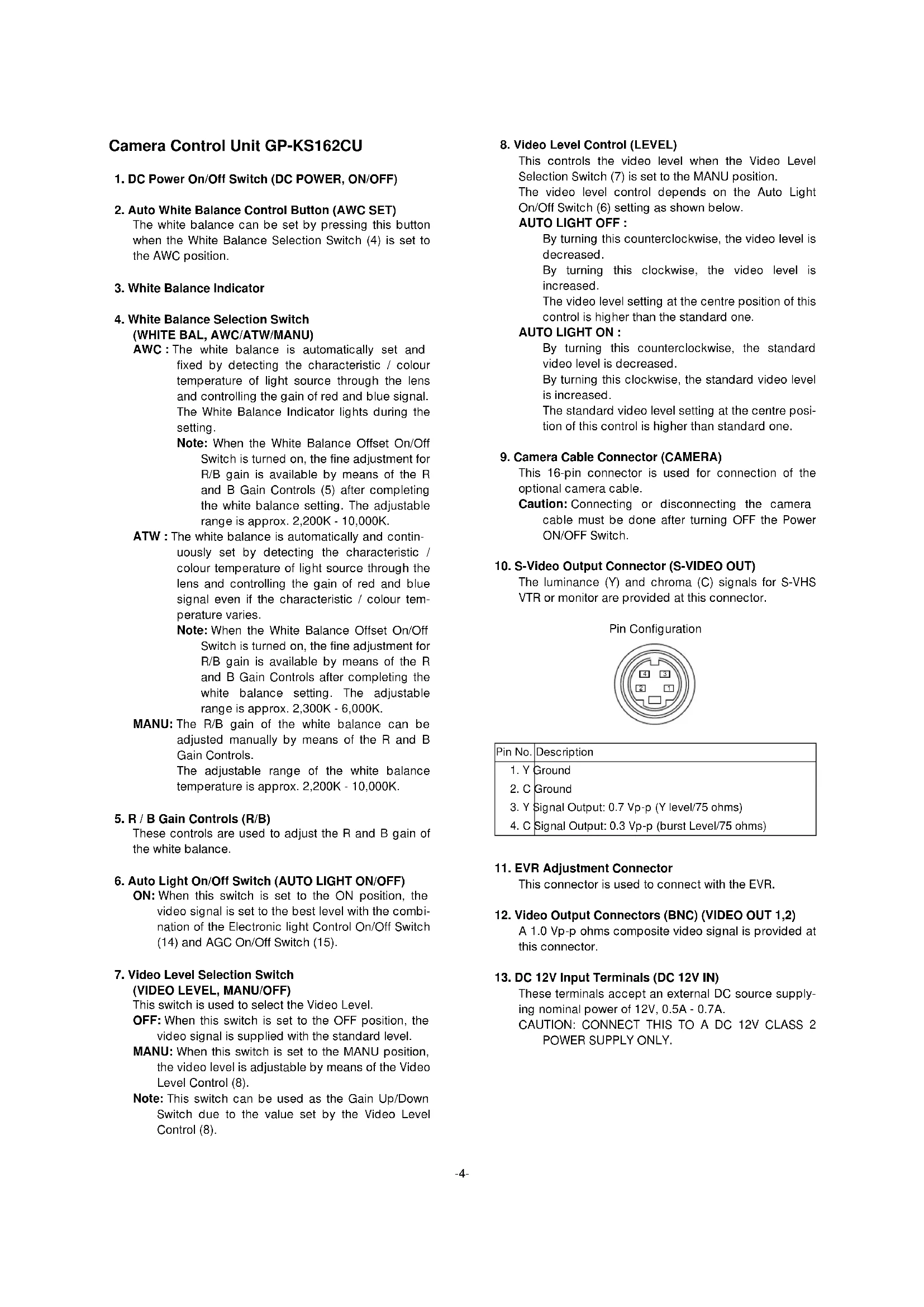 Mount the lens and C-mount adaptor by rotating them clockwise slowly. Caution: If the optional C-mount lens size exceeds 2” (50.8 mm) in diameter, 2-3/4” (70 mm) in length and 0.66 lbs. (300g) in weight, both the camera and lens should be secured. Front Cap Front Cap Focus Lock Ring Focus Lock Ring-7- SPECIFICATIONS (with the combination of Optional Camera Head GP-KS162H) Pick-up Device : 1/2-inch Interline transfer CCD image sensor with 752 (H) x 582 (V) pixels Horizontal Resolution : 480 lines Minimum Scene Illumination : 3 lux (F1.4 with AGC ON more than 30% of Y signal with set up) 5 lux (F1.6 with AGC ON more than 30% of Y signal with set up) Signal to Noise Ratio : 50 dB (Standard condition, Y signal) Video Output : 1.0 Vp-p/75 ohms, composite video, BNC connector x 2 Scanning System : 2:1 Interlace Synchronization : Internal Sync only White Balance : Auto Tracing White Balance (ATW)/Auto White Balance Control (AWC)/Manual (MANU) Gain Control : Auto Light On/Off, Video Level (Off/Manual) Switches : White Balance Mode (ATW/MANU/AWC), AWC SET (SET), Auto Light, Video Level (Off/Manual) Controls : R, B gain, VIDEO Level Power Source : 12V DC, 300 mA Camera Cable Length : GP-CA162/2 Cable 2-meter (6.6 feet), GP-CA162/3 Cable 3-meter (9.9 feet), GP-CA162/38 Cable 3.8-meter (12.5 feet), GP-CA162/10 Cable 10-meter (33 feet) Ambient Temperature : −10°C - +50°C (14°F - 104°F) Dimensions : Camera Control Unit : 120 (W) x 36 (H) x 157 (D) mm 4-11/16” (W) x 1-7/16” (H) x 6-1/8” (D) Camera Head : 17 (Diameter) x 35.5 (D) mm, (2/3” (Diameter) x 1-1/2”(D)) Weight : Camera Control Unit : 550 g (1.2 lbs.) Camera Head : 14 g (0.035 lbs.) Weight and dimensions indicated are approximate. Specifications are subject to change without notice. Optional Accessories