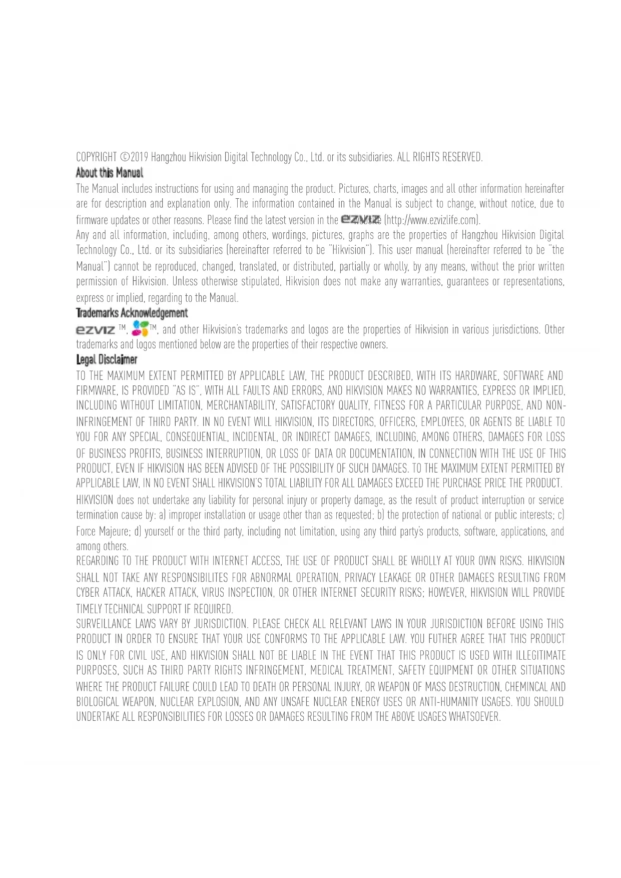 COPYRIGHT ©2019 Hangzhou Hikvision Digital Technology Co., Ltd. or its subsidiaries. ALL RIGHTS RESERVED. About this Manual The Manual includes instructions for using and managing the product. Pictures, charts, images and all other information hereinafter are for description and explanation only. The information contained in the Manual is subject to change, without notice, due to firmware updates or other reasons. Please find the latest version in the ™ website (http://www.ezvizlife.com). Any and all information, including, among others, wordings, pictures, graphs are the properties of Hangzhou Hikvision Digital Technology Co., Ltd. or its subsidiaries (hereinafter referred to be “Hikvision”). This user manual (hereinafter referred to be “the Manual”) cannot be reproduced, changed, translated, or distributed, partially or wholly, by any means, without the prior written permission of Hikvision. Unless otherwise stipulated, Hikvision does not make any warranties, guarantees or representations, express or implied, regarding to the Manual. Trademarks Acknowledgement ™, ™, and other Hikvision’s trademarks and logos are the properties of Hikvision in various jurisdictions. Other trademarks and logos mentioned below are the properties of their respective owners. Legal Disclaimer TO THE MAXIMUM EXTENT PERMITTED BY APPLICABLE LAW, THE PRODUCT DESCRIBED, WITH ITS HARDWARE, SOFTWARE AND FIRMWARE, IS PROVIDED “AS IS”, WITH ALL FAULTS AND ERRORS, AND HIKVISION MAKES NO WARRANTIES, EXPRESS OR IMPLIED, INCLUDING WITHOUT LIMITATION, MERCHANTABILITY, SATISFACTORY QUALITY, FITNESS FOR A PARTICULAR PURPOSE, AND NON- INFRINGEMENT OF THIRD PARTY. IN NO EVENT WILL HIKVISION, ITS DIRECTORS, OFFICERS, EMPLOYEES, OR AGENTS BE LIABLE TO YOU FOR ANY SPECIAL, CONSEQUENTIAL, INCIDENTAL, OR INDIRECT DAMAGES, INCLUDING, AMONG OTHERS, DAMAGES FOR LOSS OF BUSINESS PROFITS, BUSINESS INTERRUPTION, OR LOSS OF DATA OR DOCUMENTATION, IN CONNECTION WITH THE USE OF THIS PRODUCT, EVEN IF HIKVISION HAS BEEN ADVISED OF THE POSSIBILITY OF SUCH DAMAGES. TO THE MAXIMUM EXTENT PERMITTED BY APPLICABLE LAW, IN NO EVENT SHALL HIKVISION’S TOTAL LIABILITY FOR ALL DAMAGES EXCEED THE PURCHASE PRICE THE PRODUCT. HIKVISION does not undertake any liability for personal injury or property damage, as the result of product interruption or service termination cause by: a) improper installation or usage other than as requested; b) the protection of national or public interests; c) Force Majeure; d) yourself or the third party, including not limitation, using any third party’s products, software, applications, and among others. REGARDING TO THE PRODUCT WITH INTERNET ACCESS, THE USE OF PRODUCT SHALL BE WHOLLY AT YOUR OWN RISKS. HIKVISION SHALL NOT TAKE ANY RESPONSIBILITES FOR ABNORMAL OPERATION, PRIVACY LEAKAGE OR OTHER DAMAGES RESULTING FROM CYBER ATTACK, HACKER ATTACK, VIRUS INSPECTION, OR OTHER INTERNET SECURITY RISKS; HOWEVER, HIKVISION WILL PROVIDE TIMELY TECHNICAL SUPPORT IF REQUIRED. SURVEILLANCE LAWS VARY BY JURISDICTION. PLEASE CHECK ALL RELEVANT LAWS IN YOUR JURISDICTION BEFORE USING THIS PRODUCT IN ORDER TO ENSURE THAT YOUR USE CONFORMS TO THE APPLICABLE LAW. YOU FUTHER AGREE THAT THIS PRODUCT IS ONLY FOR CIVIL USE, AND HIKVISION SHALL NOT BE LIABLE IN THE EVENT THAT THIS PRODUCT IS USED WITH ILLEGITIMATE PURPOSES, SUCH AS THIRD PARTY RIGHTS INFRINGEMENT, MEDICAL TREATMENT, SAFETY EQUIPMENT OR OTHER SITUATIONS WHERE THE PRODUCT FAILURE COULD LEAD TO DEATH OR PERSONAL INJURY, OR WEAPON OF MASS DESTRUCTION, CHEMINCAL AND BIOLOGICAL WEAPON, NUCLEAR EXPLOSION, AND ANY UNSAFE NUCLEAR ENERGY USES OR ANTI-HUMANITY USAGES. YOU SHOULD UNDERTAKE ALL RESPONSIBILITIES FOR LOSSES OR DAMAGES RESULTING FROM THE ABOVE USAGES WHATSOEVER.SAVE THIS MANUAL FOR FUTURE REFERENCE IN THE EVENT OF ANY CONFLICTS BETWEEN THE ABOVE AND THE APPLICABLE LAW, THE LATER PREVAILS. Regulatory Information EU Conformity Statement This product and - if applicable - the supplied accessories too are marked with "CE" and comply therefore with the applicable harmonized European standards listed under the Radio Equipment Directive 2014/53/EU, the EMC Directive 2014/30/EU, the RoHS Directive 2011/65/EU. 2012/19/EU (WEEE directive): Products marked with this symbol cannot be disposed of as unsorted municipal waste in the European Union. For proper recycling, return this product to your local supplier upon the purchase of equivalent new equipment, or dispose of it at designated collection points. For more information see: www. recyclethis.info. 2006/66/EC and its amendment 2013/56/EU (battery directive): This product contains a battery that cannot be disposed of as unsorted municipal waste in the European Union. See the product documentation for specific battery information. The battery is marked with this symbol, which may include lettering to indicate cadmium (Cd), lead (Pb), or mercury (Hg). For proper recycling, return the battery to your supplier or to a designated collection point. For more information see: www.recyclethis.info.