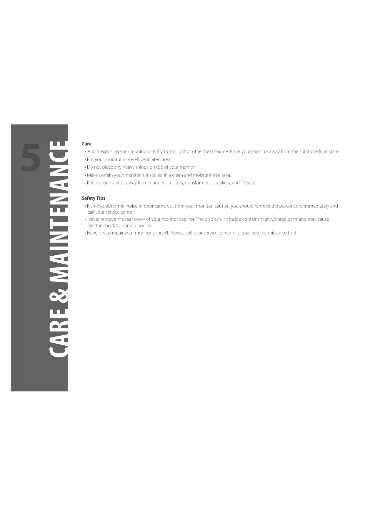 - Do not try to repair the monitor yourself as it contains no user-serviceable parts. The monitor should only be repaired by a qualied technician.