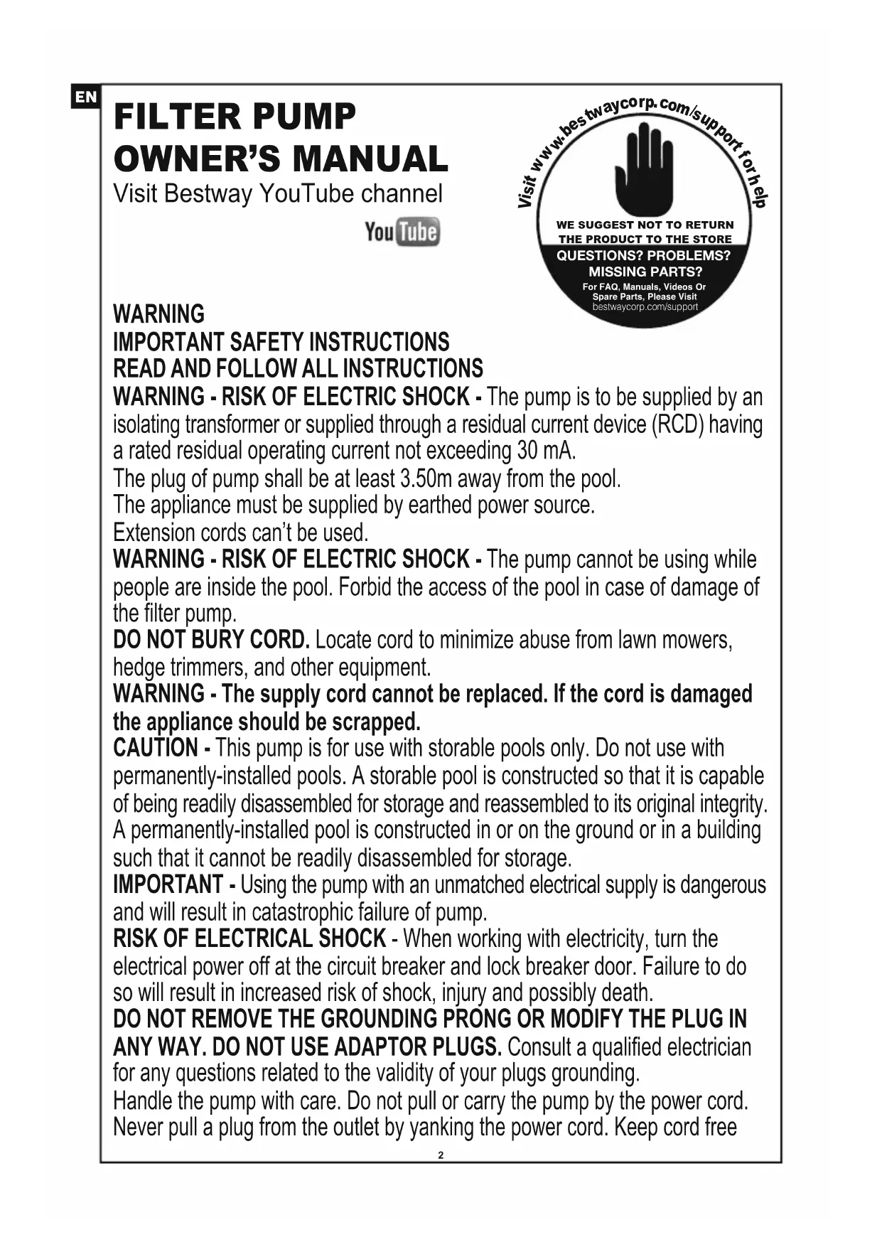 WARNINGIMPORTANT SAFETY INSTRUCTIONSREAD AND FOLLOW ALL INSTRUCTIONSWARNING - RISK OF ELECTRIC SHOCK - The pump is to be supplied by an isolating transformer or supplied through a residual current device (RCD) having a rated residual operating current not exceeding 30 mA.The plug of pump shall be at least 3.50m away from the pool.The appliance must be supplied by earthed power source.Extension cords can’t be used.WARNING - RISK OF ELECTRIC SHOCK - The pump cannot be using while people are inside the pool. Forbid the access of the pool in case of damage of the filter pump.DO NOT BURY CORD. Locate cord to minimize abuse from lawn mowers,hedge trimmers, and other equipment.WARNING - The supply cord cannot be replaced. If the cord is damaged the appliance should be scrapped.CAUTION - This pump is for use with storable pools only. Do not use with permanently-installed pools. A storable pool is constructed so that it is capable of being readily disassembled for storage and reassembled to its original integrity. A permanently-installed pool is constructed in or on the ground or in a building such that it cannot be readily disassembled for storage. IMPORTANT - Using the pump with an unmatched electrical supply is dangerous and will result in catastrophic failure of pump. RISK OF ELECTRICAL SHOCK - When working with electricity, turn the electrical power off at the circuit breaker and lock breaker door. Failure to do so will result in increased risk of shock, injury and possibly death. DO NOT REMOVE THE GROUNDING PRONG OR MODIFY THE PLUG IN ANY WAY. DO NOT USE ADAPTOR PLUGS. Consult a qualified electrician for any questions related to the validity of your plugs grounding. Handle the pump with care. Do not pull or carry the pump by the power cord. Never pull a plug from the outlet by yanking the power cord. Keep cord free from abrasions. Sharp objects, oil, moving parts, and heat should never be exposed to the filter pump. WARNING - This appliance can be used by children aged from 8 years and above and persons with reduced physical, sensory or mental capabilities or lack of experience and knowledge if they have been given supervision or instruction concerning use of the appliance in a safe way and understand the hazards involved. Children shall not play with the appliance. Cleaning and user maintenance shall not be made by children without supervision. (For EU market) WARNING - This appliance is not intended for use by persons (including children) with reduced physical, sensory or mental capabilities, or lack of experience and knowledge, unless they have been given supervision or instruction concerning use of the appliance by a person responsible for their safety. Children should be supervised to ensure that they do not play with the appliance. (For market other than EU) Cleaning and user maintenance must be performed by an adult above 18 years old who is familiar with the risk of electric shock. When the appliance will be not used for a long time, such as in the winter, the pool set should be disassembled and stored indoor. CAUTION - Read the instruction before using the appliance and installation/reassembly every time.The appliance must be placed more than 2m away from the pool. (For France only). Electric installations should follow national wiring rules. Consult a qualified electrician for any questions.Only the media provided or specified by the manufacturer is to be used with product installation.It is essential to check that the suction openings are not obstructed. It is advisable to stop the filtration during maintenance operations on the filtration system.Regularly monitor the filter clogging level.A weekly check is recommended for cleaning.Minimum daily filtration operating time of 8 hours is recommended to ensure clear pool water.It is essential to change any damaged element or set of elements as soon as possible. Use only parts approved by person responsible for placing the product on the market. All filters and filter media shall be inspected regularly to ensure that there is not a build-up of detritus thus preventing good filtration. The disposal of any used filter media should also be in accordance with applicable regulations/legislation.In case of doubt on the pump or any circulation devices, contact a qualified installer, or the manufacturer/importer/distributor. The water circulation installation shall comply with the European as well as national/local regulations, especially when dealing with electrical issues.Any change of valve position, pump size, grille size can cause a change of the flow and the suction velocity can be increased.Mind all the safety requirements and recommendations described in the manual.NOTE: Please examine equipment before use. Notify Bestway at the customer service address listed on this manual for any manufacturing defect or missing parts at the time of purchase. Verify that the equipment components represent the filter pump model that you had intended to purchase.NOTE:Place pump on a solid and level ground. Pay attention to position of pool and pump so adequate ventilation, drainage, and access for cleaning is available. Never place pump in an area that may accumulate water, or in an area where foot traffic will flow around the pool. It is necessary to have the plug accessible after installation of the pool.NOTE: Atmospheric conditions may affect the performance and life span of your filter pump. Unnecessary wear and tear may occur during periods of cold, heat and exposure to sun. Whenever possible shelter pump from these conditions. It is important to ensure the factory equipped stopper plugs for the inlet and outlet ports replace the screens before removal or maintenance on the pump is attempted.NOTE:Do not add chemicals in the filter pump.Don’t plug or unplug the appliance if hand is wet.Always unplug the appliance:• On raining days• Before cleaning or other maintenance• Leave it unattended on holidaysSafekeeping the instruction. For recon