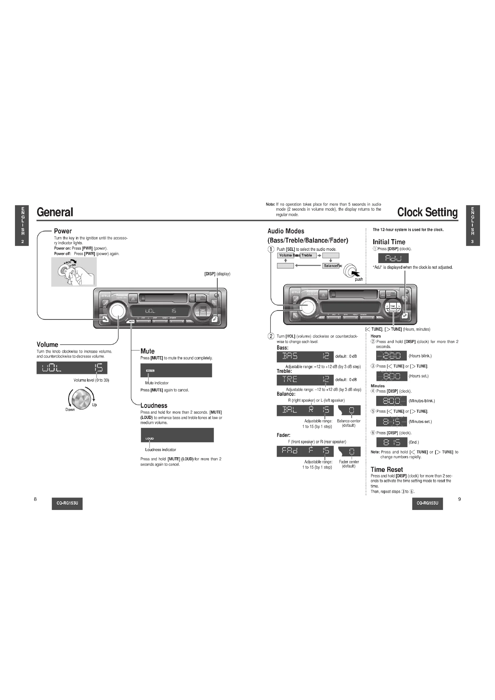 Specifications ❐ General Power Supply : 12 V DC (11 V-16V) test Voltage 14.4 V, Negative groundCurrent consumption : Less than 2.5 A (tape mode, 0.5 W 4-speaker)Maximum Power Output : 45 W × 4 channels at 400 Hz, Volume Control maximumTone adjustment range : Bass; ± 12 dB at 100 HzTreble; ± 12 dB at 10 kHzPre-Amp Output Voltage : 2.0 V (CD Play mode; 1 kHz 0 dB) Suitable Speaker Impedance : 4 Ω (4-8 Ω acceptable) Dimensions (W × H × D) : 7" × 1-15/16" × 6-1/10" (178 × 50 × 155 mm) Weight : 3 lbs. 8 oz. (1.6 kg) ❐ FM Stereo Radio Frequency Range : 87.9-107.9 MHzUseable Sensitivity : 12 dBf. (1.1 µV/75 W, S/N 30 dB)50 dB Quieting Sensitivity : 17 dBf. (1.8 µV/75W)Frequency Response : 30-15 000 Hz ±3 dBAlternate Channel Selectivity : 75 dBStereo Separation : 35 dB at 1 kHzSignal/Noise Ratio : 70 dB (Mono) ❐ AM Radio Frequency range: : 530 kHz–1710 kHz Usable sensitivity: : 28 dB/µV (25µV, S/N 20 dB) ❐ Tape Player Reproduction System : 4-track, 2-program stereoTape Speed : 1-7/8"/sec (4.76 cm/sec)FF/REW Time : Less than 200 sec (C-60)Frequency Response : 35-14 000 Hz ±3 dBWow and Flutter : 0.12% (WRMS)signal/Noise Ratio : 52 dBAbove specifications comply with EIA standards. Note: Specifications and design are subject to modification without notice due to improvements in technology.29 CQ-RG153U