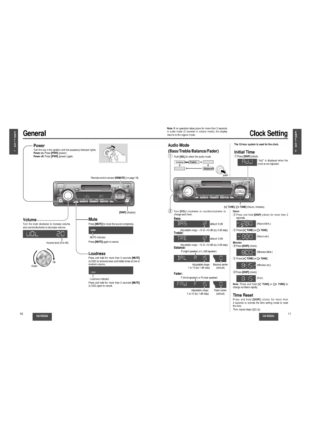 TRACK TUNE Audio Mode (Bass/Treble/Balance/Fader) The 12-hour system is used for the clock. Push [SEL] to select the audio mode. Volume Bass Treble BalanceFader [] TUNE], [[ TUNE] (Hours, minutes) Hours w Press and hold [DISP] (clock) for more than 2 seconds. Initial Time q Press [DISP] (clock). (Hours blink.) e Press [] TUNE] or [[ TUNE]. (Hours set.) Minutes r Press [DISP] (clock). (Minutes blink.) t Press [] TUNE] or [[ TUNE]. (Minutes set.) y Press [DISP] (clock). Note: Press and hold [] TUNE] or [[ TUNE] to change numbers rapidly. Time Reset Press and hold [DISP] (clock) for more than 2 seconds to activate the time setting mode to reset the time. Then, repeat steps to . (End.) “AdJ” is displayed when the clock is not adjusted. Turn [VOL] clockwise or counterclockwise to change each level. Bass: Adjustable range: –12 to +12 dB (by 3 dB step) Treble: Adjustable range: –12 to +12 dB (by 3 dB step) Balance: Adjustable range: 1 to 15 (by 1 dB step) Balance center (default) R (right speaker) or L (left speaker) Fader: Adjustable range: 1 to 15 (by 1 dB step) Fader center (default) F (front speaker) or R (rear speaker) push