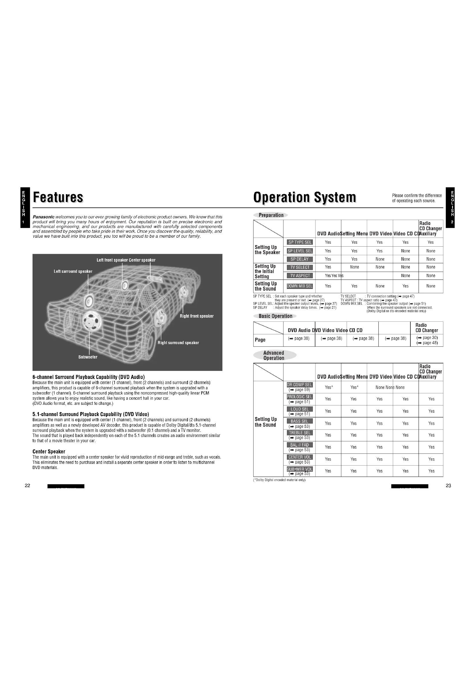 Features Features Operation System Operation System Panasonic welcomes you to our ever growing family of electronic product owners. We know that this product will bring you many hours of enjoyment. Our reputation is built on precise electronic and mechanical engineering, and our products are manufactured with carefully selected components and assembled by people who take pride in their work. Once you discover the quality, reliability, and value we have built into this product, you too will be proud to be a member of our family. Left surround speakerLeft front speaker Center speakerRight front speakerRight surround speakerSubwoofer 6-channel Surround Playback Capability (DVD Audio) Because the main unit is equipped with center (1 channel), front (2 channels) and surround (2 channels)amplifiers, this product is capable of 6-channel surround playback when the system is upgraded with asubwoofer (1 channel). 6-channel surround playback using the noncompressed high-quality linear PCMsystem allows you to enjoy realistic sound, like having a concert hall in your car.(DVD Audio format, etc. are subject to change.) 5.1-channel Surround Playback Capability (DVD Video) Because the main unit is equipped with center (1 channel), front (2 channels) and surround (2 channels)amplifiers as well as a newly developed AV decoder, this product is capable of Dolby Digital/dts 5.1-channelsurround playback when the system is upgraded with a subwoofer (0.1 channel) and a TV monitor. The sound that is played back independently on each of the 5.1 channels creates an audio environment similarto that of a movie theater in your car. Center Speaker The main unit is equipped with a center speaker for vivid reproduction of mid-range and treble, such as vocals.This eliminates the need to purchase and install a separate center speaker in order to listen to multichannelDVD materials.Please confirm the differenceof operating each source. Yes Yes Yes Yes Yes Yes Yes Yes Yes* Yes Yes Yes Yes Yes Yes Yes Yes* Yes Yes Yes Yes Yes Yes Yes Yes Yes Yes Yes Yes Yes Yes Yes Yes Yes Yes Yes Yes Yes Yes Yes Yes Yes Yes Yes Yes Yes Yes Yes Yes Yes Yes Yes None None None None Yes None None None None None None None None None None None None Yes Radio CD Changer Auxiliary DVD AudioSetting Menu DVD Video Video CD CD Radio CD Changer Auxiliary DVD AudioSetting Menu DVD Video Video CD CD Radio CD Changer DVD Audio DVD Video Video CD CD Setting Up the Speaker (➡ page 30)(➡ page 48) Setting Up the Initial Setting Setting Up the Sound Page Setting Up the Sound SP TYPE SELSP LEVEL SELSP DELAYTV SELECTTV ASPECTDOWN MIX SEL Preparation Basic Operation Advanced Operation SP TYPE SEL : Set each speaker type and whether they are present or not. (➡ page 27)SP LEVEL SEL: Adjust the speaker output levels. (➡ page 27)SP DELAY : Adjust the speaker delay times. (➡ page 27)TV SELECT : TV connection setting (➡ page 47)TV ASPECT : TV aspect ratio (➡ page 47)DOWN MIX SEL : Combining the speaker output (➡ page 51)When the surround speakers are not connected. (Dolby Digital or dts encoded material only) (➡ page 38) (➡ page 38) (➡ page 38) (➡ page 38) DR COMP SEL(➡ page 59)(*Dolby Digital encoded material only)PROLOGIC SEL(➡ page 51)LOUD SEL(➡ page 51)BASS SEL(➡ page 53)TREBLE SEL(➡ page 53)BAL // FAD(➡ page 53)CENTER VOL(➡ page 53) SUB