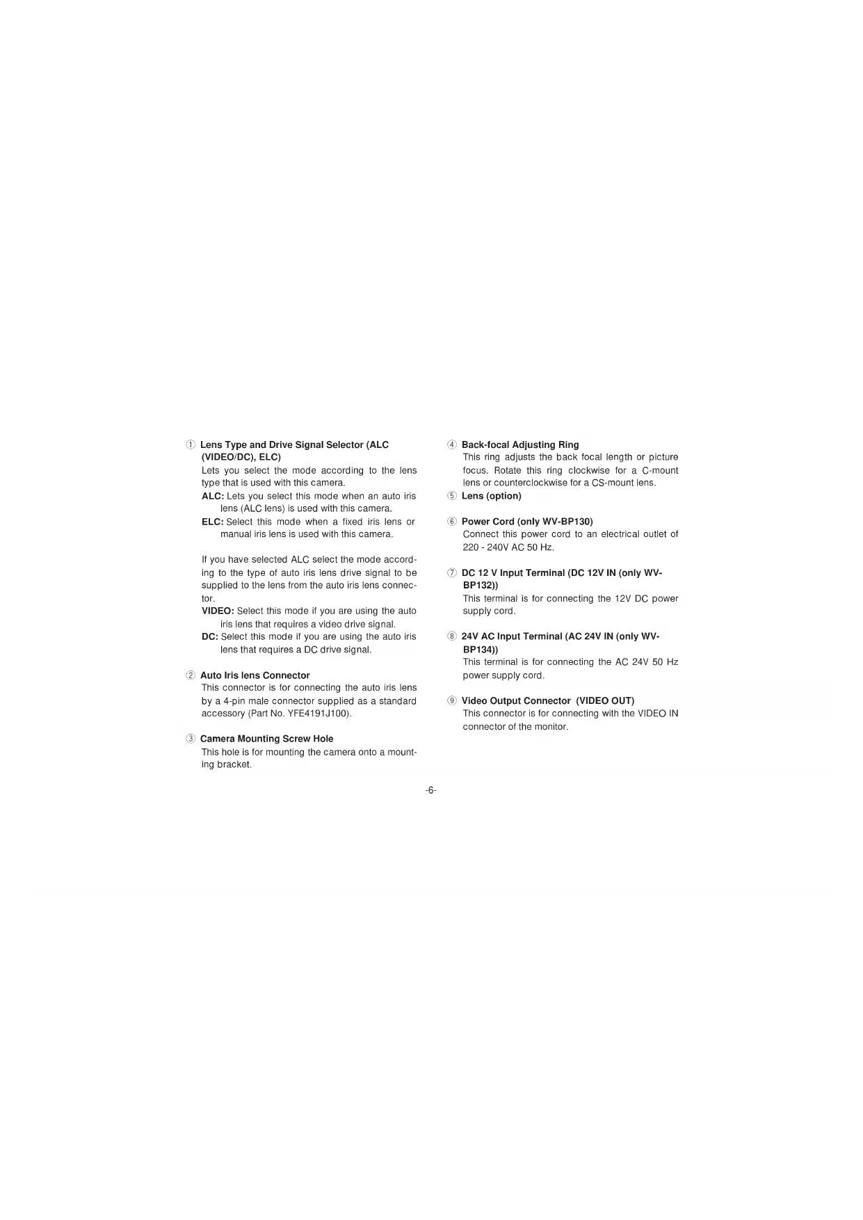 ALC ELC BLC OFF ON ALC ELC BLC OFF ON ALC ELC BLC WV-BP130 WV-BP132 WV-BP134 MAJOR OPERATING CONTROLS AND THEIR FUNCTIONSq Lens Type and Drive Signal Selector (ALC (VIDEO/DC), ELC) Lets you select the mode according to the lens type that is used with this camera. ALC: Lets you select this mode when an auto iris lens (ALC lens) is used with this camera. ELC: Select this mode when a fixed iris lens or manual iris lens is used with this camera. If you have selected ALC select the mode accord- ing to the type of auto iris lens drive signal to be supplied to the lens from the auto iris lens connec- tor. VIDEO: Select this mode if you are using the auto iris lens that requires a video drive signal. DC: Select this mode if you are using the auto iris lens that requires a DC drive signal. w Auto Iris lens Connector This connector is for connecting the auto iris lens by a 4-pin male connector supplied as a standard accessory (Part No. YFE4191J100). e Camera Mounting Screw Hole This hole is for mounting the camera onto a mount- ing bracket. r Back-focal Adjusting Ring This ring adjusts the back focal length or picture focus. Rotate this ring clockwise for a C-mount lens or counterclockwise for a CS-mount lens. t Lens (option) y Power Cord (only WV-BP130) Connect this power cord to an electrical outlet of