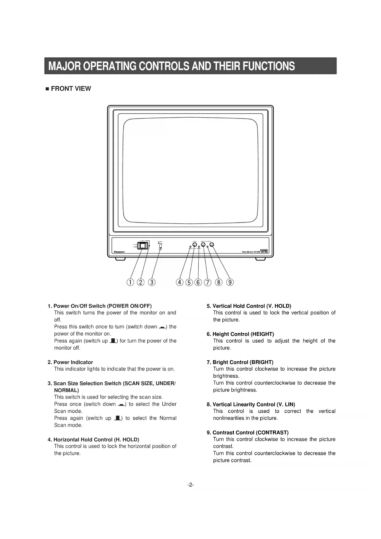 SONNEL. CAUTION RISK OF ELECTRIC SHOCKDO NOT OPENTHIS APPARATUS MUST BE EARTHED.To ensure safe operation the three-pin plug supplied must be insert-ed only into a standard three-pin power point which is effectivelyearthed through the normal household wiring. Extension cords usedwith the equipment must be three-core and be correctly wired to pro-vide connection to earth. Wrongly wired extension cords are a majorcause of fatalities.The fact that the equipment operates satisfactorily does not implythat the power point is earthed and that the installation is completelysafe. For your safety, if in any doubt about the effective earthing ofthe power point, consult a qualified electrician.For AustraliaFOR YOUR SAFETY PLEASE READ THE FOLLOWING TEXT CARE-FULLY.This appliance is supplied with a moulded three pin mains plug for yoursafety and convenience.A 5 amp fuse is fitted in this plug.Should the fuse need to be replaced please ensure that the replacementfuse has a rating of 5 amp and that it is approved by ASTA or BSI toBS1362.Check for the ASTA mark H or the BSI mark G on the body of the fuse.If the plug contains a removable fuse cover you must ensure that it isrefitted when the fuse is replaced.If you lose the fuse cover the plug must not be used until a replacementcover is obtained.A replacement fuse cover can be purchased from your local PanasonicDealer.IF THE FITTED MOULDED PLUG IS UNSUITABLE FOR THE SOCK-ET OUTLET IN YOUR HOME THEN THE FUSE SHOULD BEREMOVED AND THE PLUG CUT OFF AND DISPOSED OF SAFELY.THERE IS A DANGER OF SEVERE ELECTRICAL SHOCK IF THECUT OFF PLUG IS INSERTED INTO ANY 5 AMP SOCKET.If a new plug is to be fitted please observe the wiring code as shownbelow.If in any doubt please consult a qualified electrician.WARNING: This apparatus must be earthed.IMPORTANTThe wires in this mains lead are coloured in accordance with the follow-ing code.Green-and-yellow: EarthBlue: NeutralBrown: LiveAs the colours of the wire in the mains lead of this appliance may notcorrespond with the coloured markings identifying the terminals in yourplug, proceed as follows.The wire which is coloured green-and-yellow must be connected to the terminal in the plug which is marked with the letter E or by the earth symbol I or coloured green or green-and-yellow. The wire which is coloured blue must be connected to the terminal in the plug which is marked with the letter N or coloured black. The wire which is coloured brown must be connected to the terminal in the plug which is marked with the letter L or coloured red. How to replace the fuseOpen the fuse compartment witha screwdriver and replace the fuseand fuse cover.For U.K.Wij verklaren als enige aansprakelijke, dat het product waarop dezeverklaring betrekking heeft, voldoet aan de volgende normen ofandere normatiefve dokumenten, overeenkomstig de bepalingenvan Richtlijnen 73/23/EEC en 89/336/EEC.Vi erklærer os eneansvarlige for, at dette produkt, som dennedeklaration omhandler, er i overensstemmelse med den følgendestandarder eller andre normative dokumenter i følge bestem-melserne i direktivene 73/23/EEC og 89/336/EEC.Vi deklarerar härmed värt fulla ansvar för att den produkt till vilkendenna deklaration hänvisar är i överensstämmelse med standard-dokument, eller andra normativa dokument som framstölls i Direktiv73/23/EEC och 89/336/EEC.Ilmoitamme yksinomaisella vastuullamme, että tuote, jota tämäilmoitus koskee, noudattaa seuraavia standardeja tai muita ohjeel-lisia asiakirjoja, jotka noudattavat direktiivien 73/23/EEC ia89/336/EEC. säädöksiä.Vi erklærer oss alene ansvarlige for at produktet som denneerklæringen gjelder for, er i overensstemmelse med følgendenormer eller andre normgivende dokumenter som fælger bestem-melsene i direktiven 73/23/EEC og 89/336/EEC.We declare under our sole responsibility that the product to whichthis declaration relates is in conformity with the standards or othernormative documents following the provisions of DirectivesEEC/73/23 and EEC/89/336.Noi dichiariamo sotto nostra esclusiva responsabilità che il prodottoa cui si riferisce la presente dichiarazione risulta conforme aiseguenti standard o altri documenti normativi conformi alle dispo-sizioni delle direttive CEE/73/23 e CEE/89/336. The serial number of this product may be found on the rear of the unit. You should note the serial number of this unit in the space provided and retain this book as a permanent record of your purchase to aid identification in the event of theft. Model No. WV-BM1910 Serial No. ENGLISH VERSION-1- The Panasonic WV-BM1910 Video Monitor is a desk-top closed circuit Video Monitor especially designed for surveillance and studio applications. This monitor features a 473 mm (18-5/8”) actual diagonal viewing size screen and produces sharp,