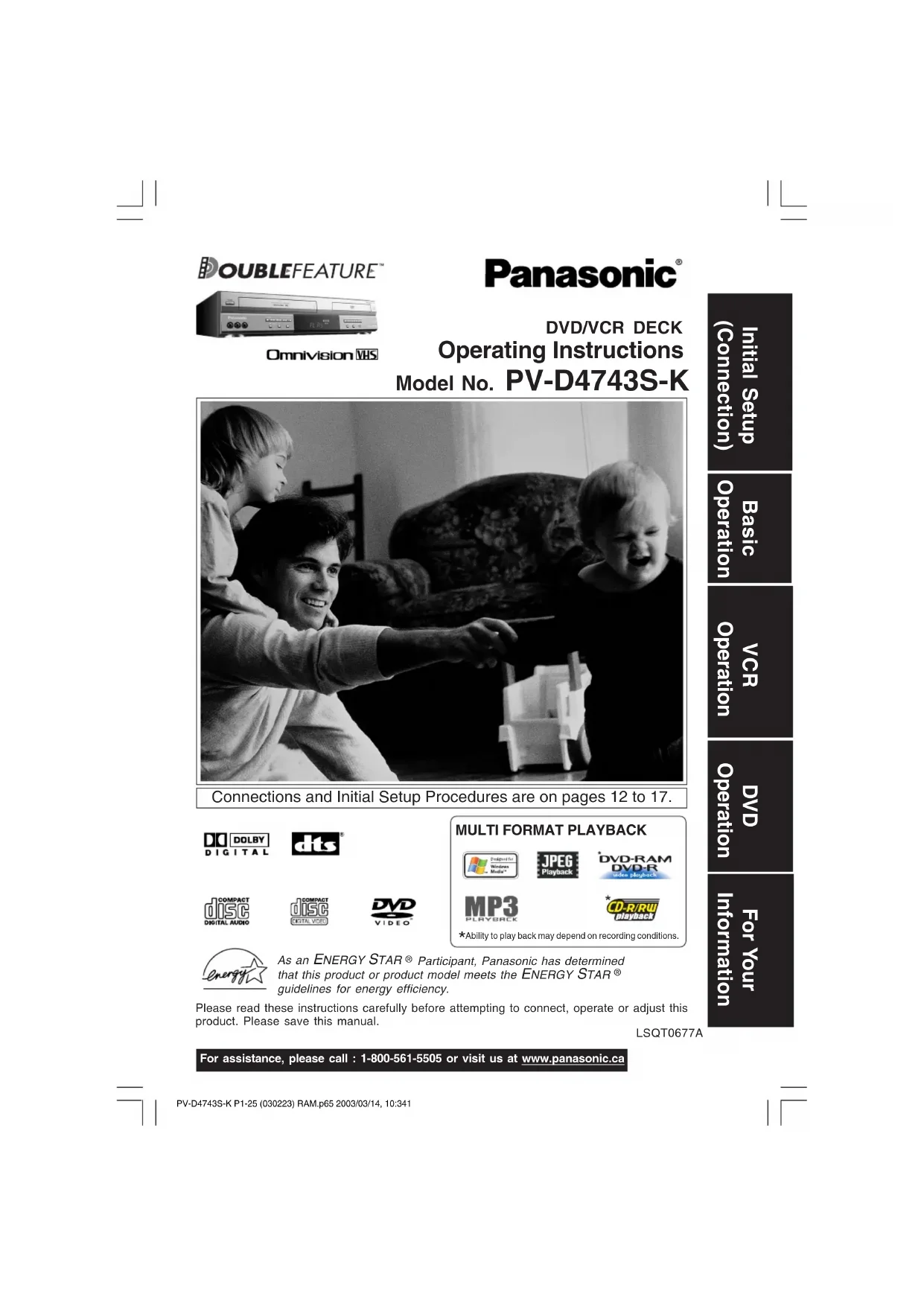 guidelines for energy efficiency.Please read these instructions carefully before attempting to connect, operate or adjust thisproduct. Please save this manual.For assistance, please call : 1-800-561-5505 or visit us at www.panasonic.ca Initial Setup (Connection) Basic Operation VCR Operation For Your Information DVD Operation PV-D4743S-K P1-25 (030223) RAM.p65 2003/03/14, 10:341INSTALLATION