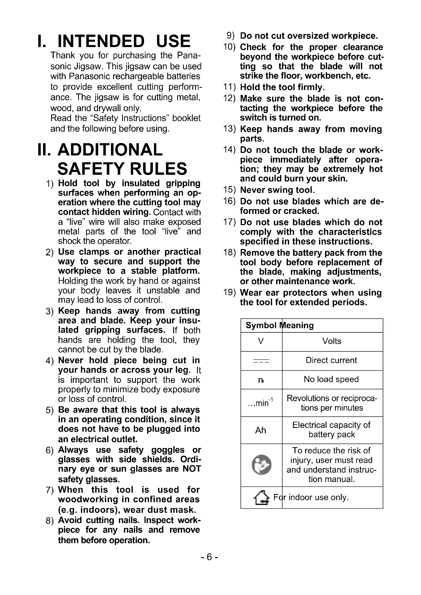 Thank you for purchasing the Pana- sonic Jigsaw. This jigsaw can be used with Panasonic rechargeable batteries to provide excellent cutting perform- ance. The jigsaw is for cutting metal, wood, and drywall only. Read the “Safety Instructions” booklet and the following before using.