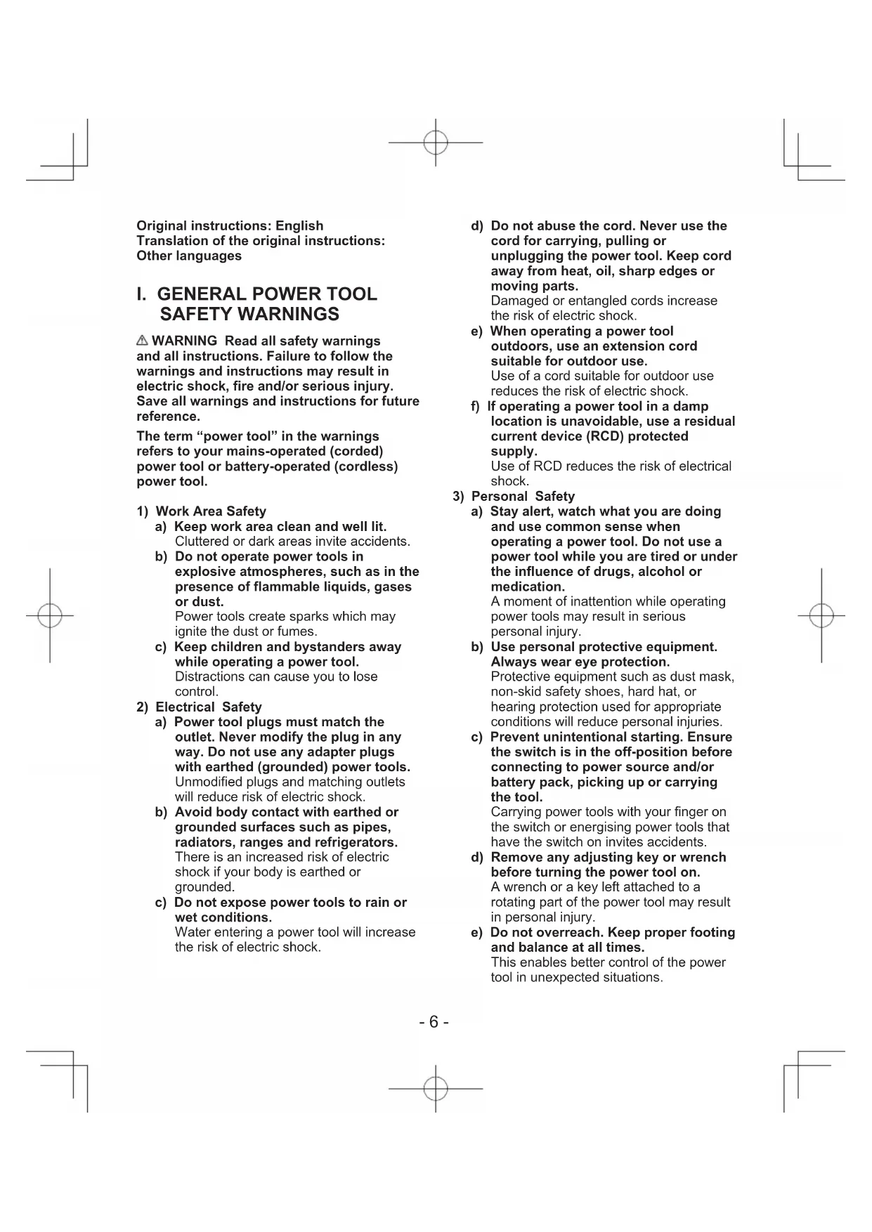 a) Do not force the power tool. Use the correct power tool for your application. The correct power tool will do the job better and safer at the rate for which it was designed. b) Do not use the power tool if the switch does not turn it on and off. Any power tool that cannot be controlled with the switch is dangerous and must be repaired. c) Disconnect the plug from the power source and/or the battery pack from the power tool before making any adjustments, changing accessories, or storing power tools. Such preventive safety measures reduce the risk of starting the power tool accidentally. d) Store idle power tools out of the reach of children and do not allow persons unfamiliar with the power tool or these instructions to operate the power tool. Power tools are dangerous in the hands of untrained users. e) Maintain power tools. Check for misalignment or binding of moving parts, breakage of parts and any other condition that may affect the power tool’s operation. If damaged, have the power tool repaired before use. Many accidents are caused by poorly maintained power tools. f) Keep cutting tools sharp and clean. Properly maintained cutting tools with sharp cutting edges are less likely to bind and are easier to control. g) Use the power tool, accessories and tool bits etc., in accordance with these instructions, taking into account the working conditions and the work to be performed. Use of the power tool for operations different from those intended could result in a hazardous situation. h) Hold power tools by insulated gripping surfaces when performing an operation where the power tool may contact hidden wiring. Contact with a “live” wire will make exposed metal parts of the tool “live” and shock the operator.