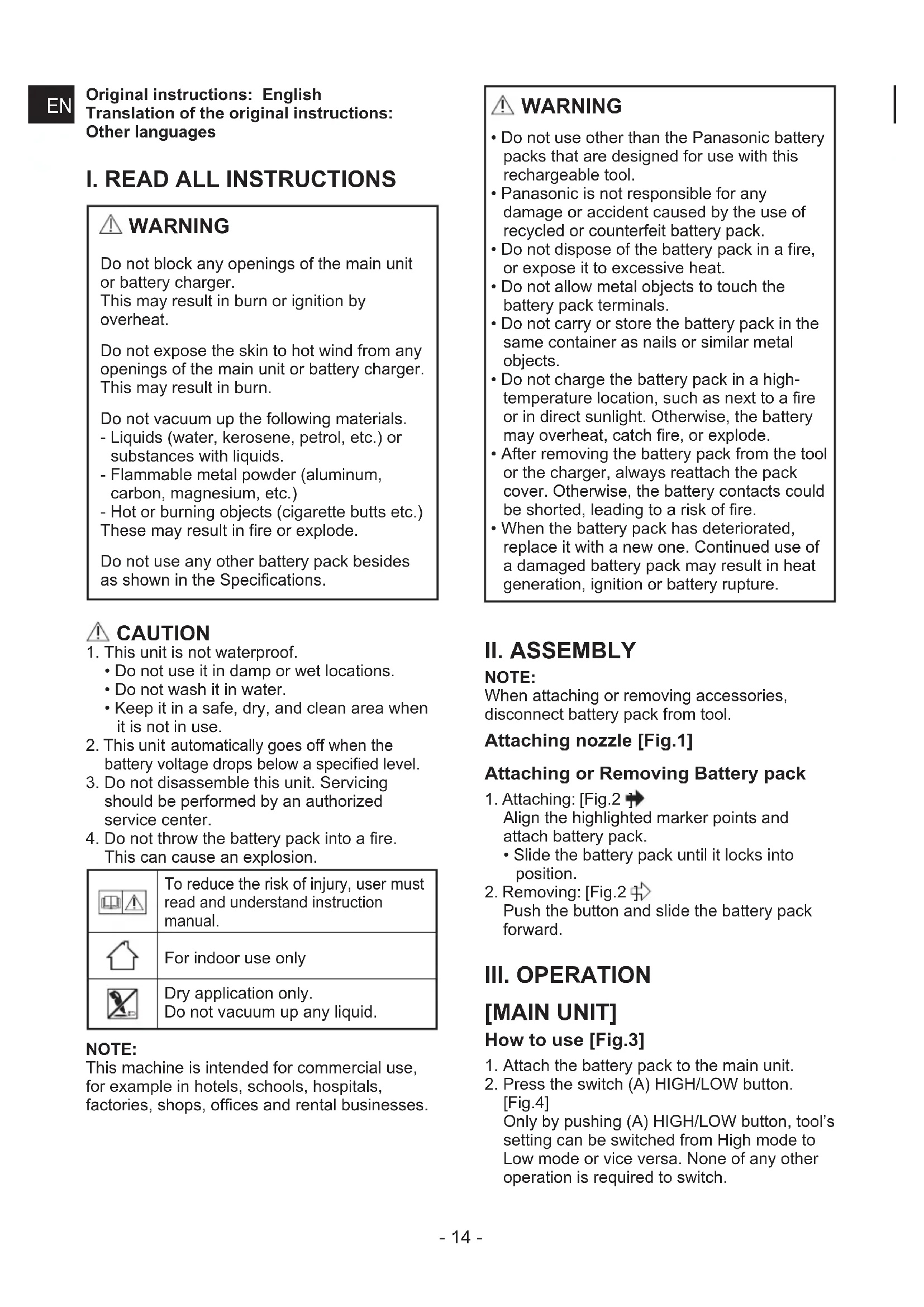 WARNING Do not block any openings of the main unit or battery charger. This may result in burn or ignition by overheat. Do not expose the skin to hot wind from any openings of the main unit or battery charger. This may result in burn. Do not vacuum up the following materials. - Liquids (water, kerosene, petrol, etc.) or substances with liquids. - Flammable metal powder (aluminum, carbon, magnesium, etc.) - Hot or burning objects (cigarette butts etc.) These may result in fire or explode. Do not use any other battery pack besides as shown in the Specifications. CAUTION