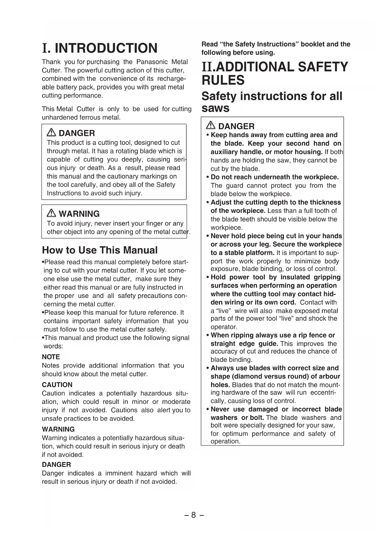 Thank you for purchasing the Panasonic Metal Cutter. The powerful cutting action of this cutter, combined with the convenience of its recharge-able battery pack, provides you with great metal cutting performance.This Metal Cutter is only to be used for cutting unhardened ferrous metal. DANGER This product is a cutting tool, designed to cut through metal. It has a rotating blade which is capable of cutting you deeply, causing seri-ous injury or death. As a result, please read this manual and the cautionary markings on the tool carefully, and obey all of the Safety Instructions to avoid such injury. WARNING To avoid injury, never insert your finger or any other object into any opening of the metal cutter. How to Use This Manual