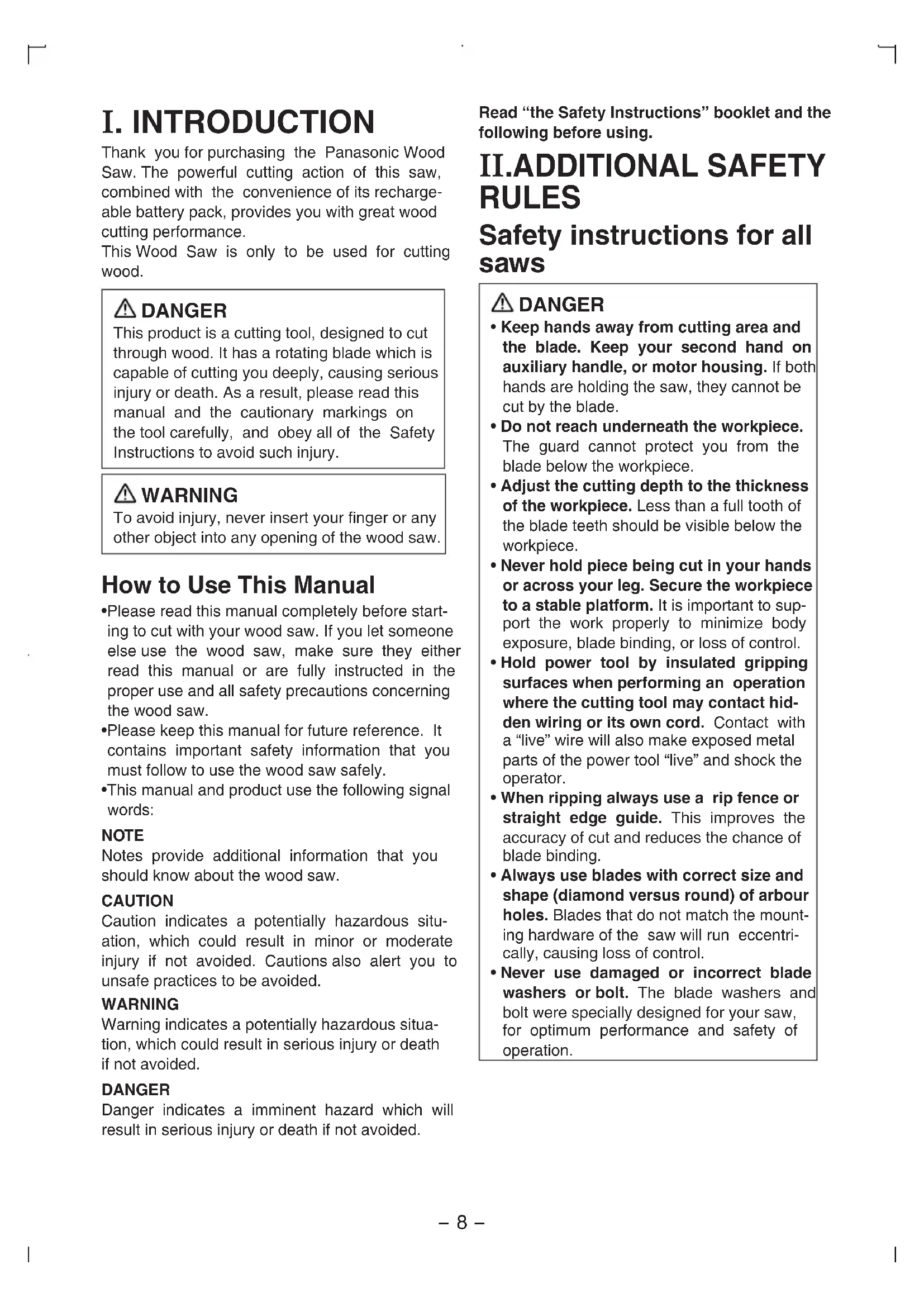 Thank you for purchasing the Panasonic Wood Saw. The powerful cutting action of this saw, combined with the convenience of its recharge-able battery pack, provides you with great wood cutting performance.This Wood Saw is only to be used for cutting wood. DANGER This product is a cutting tool, designed to cut through wood. It has a rotating blade which is capable of cutting you deeply, causing serious injury or death. As a result, please read this manual and the cautionary markings on the tool carefully, and obey all of the Safety Instructions to avoid such injury. WARNING To avoid injury, never insert your finger or any other object into any opening of the wood saw. How to Use This Manual