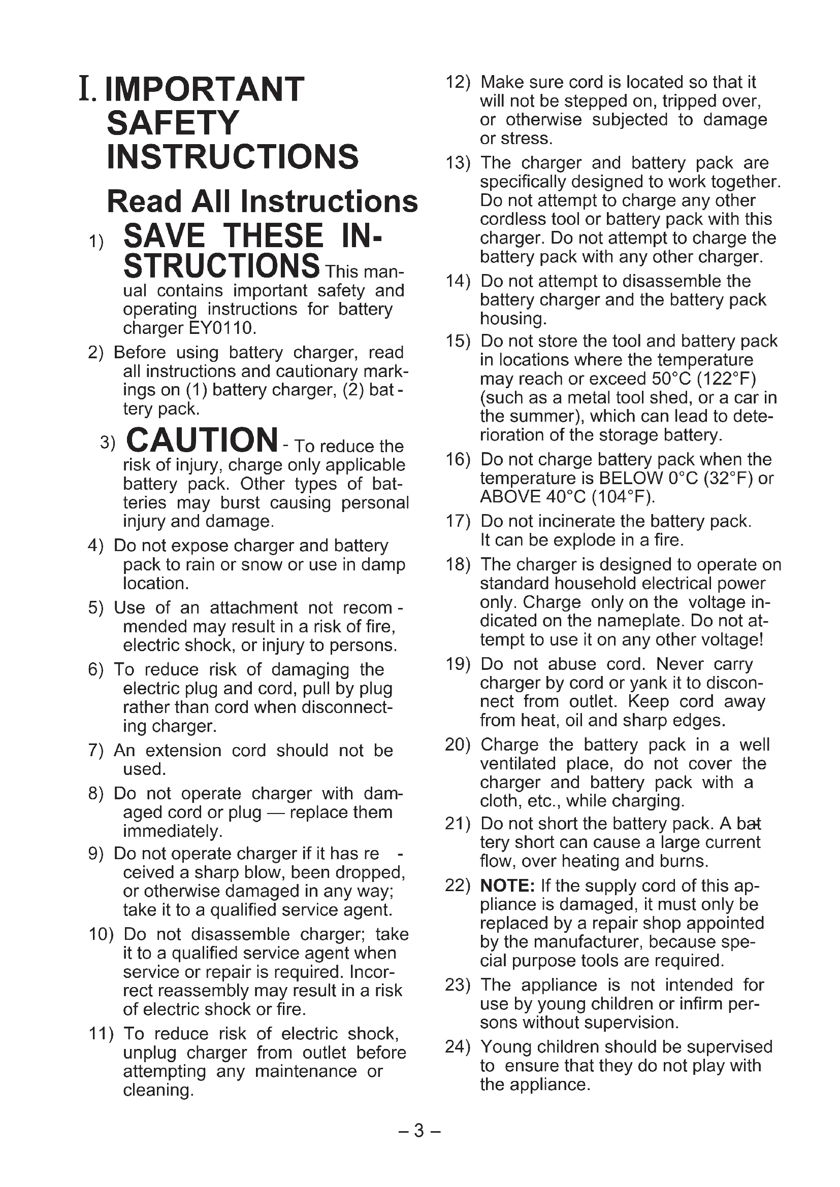 STRUCTIONS - This man- ual contains important safety and operating instructions for battery charger EY0110.