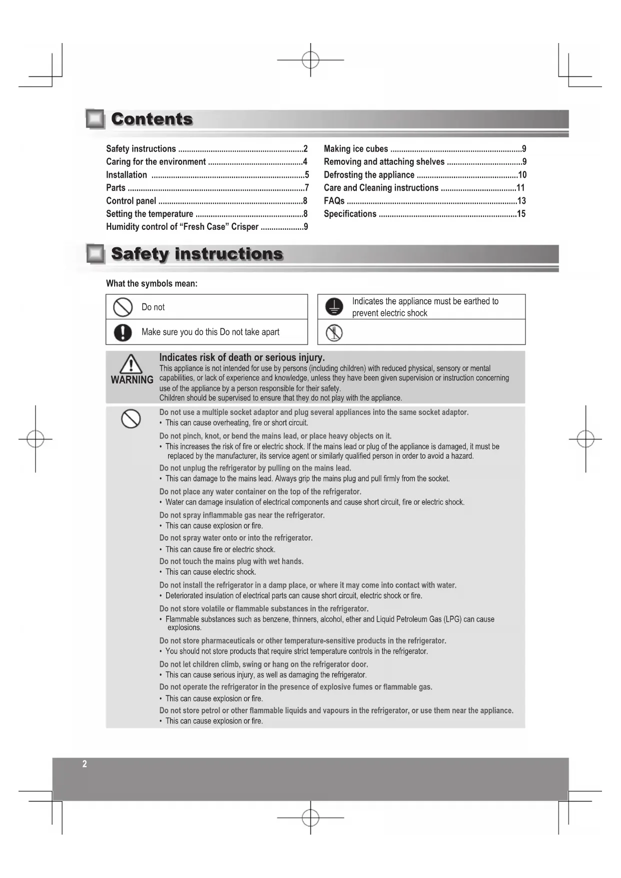 - You may injure yourself – or others – with burns or electric shock, or damage the refrigerator. If your appliance needs alterations or repair, please consult authorized service centre.Ensure that the refrigerator is plugged into an earthed mains socket. DO NOT plug into an unearthed mains socket.• A short circuit could cause an electrical shock.Make sure the mains lead and plug are not squashed or damaged.• A damaged mains plug or lead can cause short-circuit, re or electric shock.