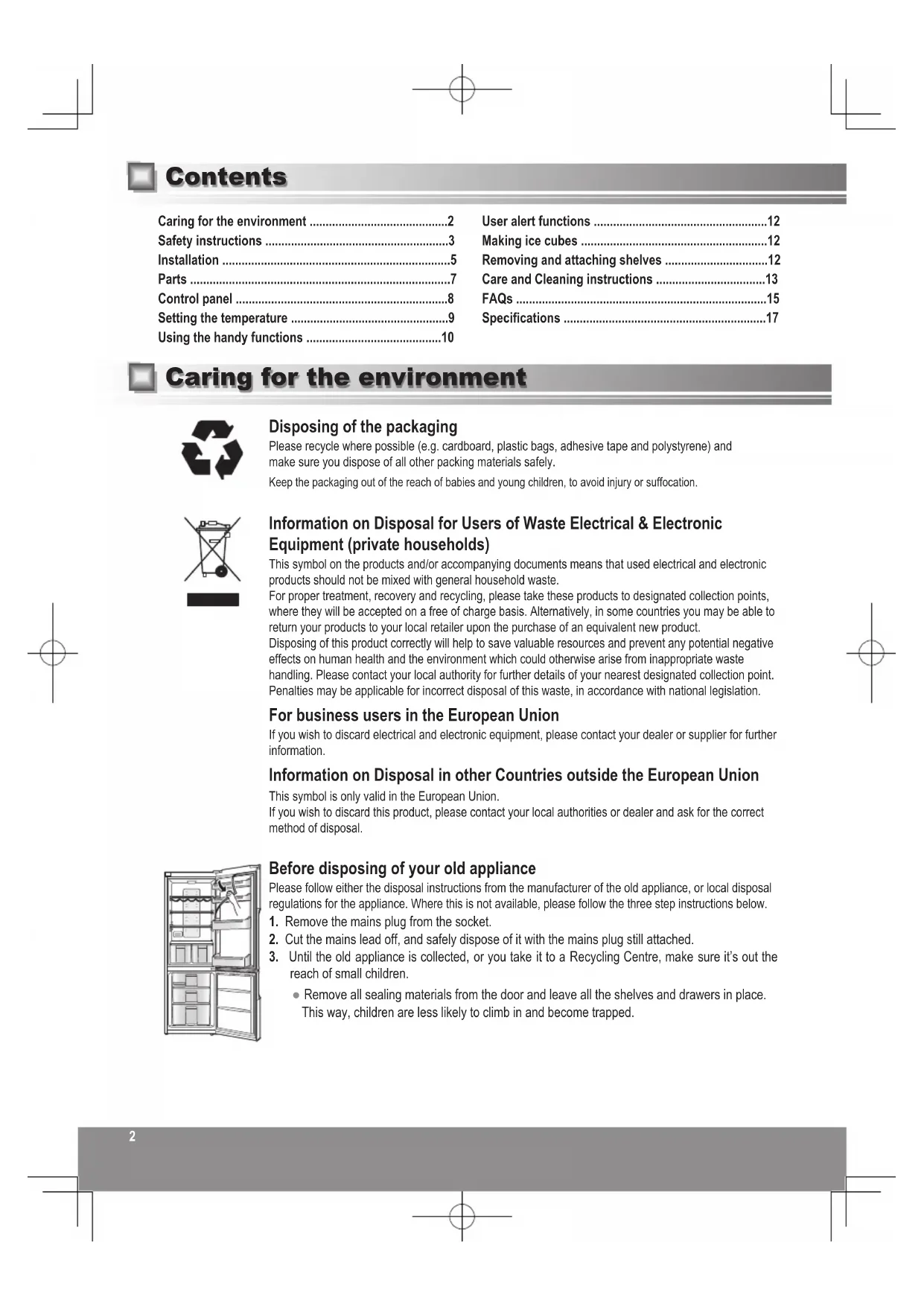 reach of small children. ● Remove all sealing materials from the door and leave all the shelves and drawers in place. This way, children are less likely to climb in and become trapped. Caring for the environment Contents3 English