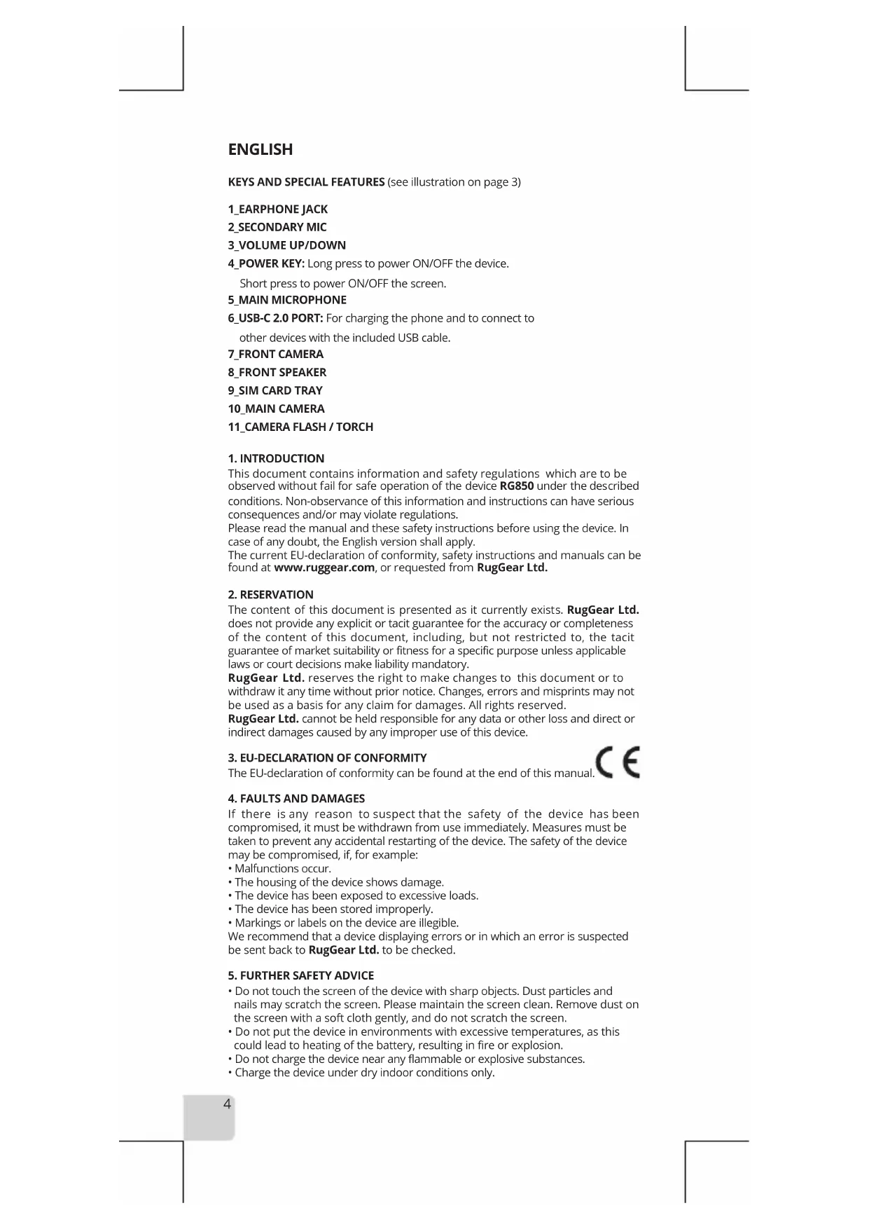 This document contains information and safety regulations which are to be observed without fail for safe operation of the device RG850 under the described conditions. Non-observance of this information and instructions can have serious consequences and/or may violate regulations. Please read the manual and these safety instructions before using the device. In case of any doubt, the English version shall apply. The current EU-declaration of conformity, safety instructions and manuals can be found at www.ruggear.com, or requested from RugGear Ltd.