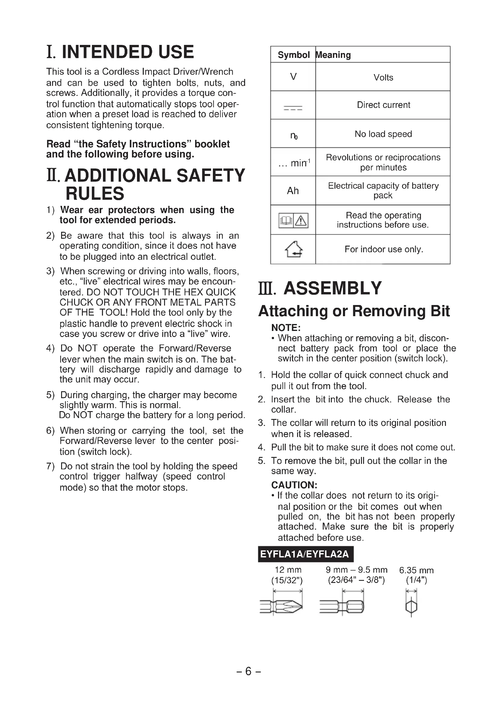 No load speed… min Revolutions or reciprocations per minutes Electrical capacity of battery pack Read the operating instructions before use.For indoor use only. III . ASSEMBLY Attaching or Removing Bit NOTE: When attaching or removing a bit, discon-nect battery pack from tool or place the switch in the center position (switch lock).1. Hold the collar of quick connect chuck and pull it out from the tool. Insert the bit into the chuck. Release the collar. The collar will return to its original position when it is released.