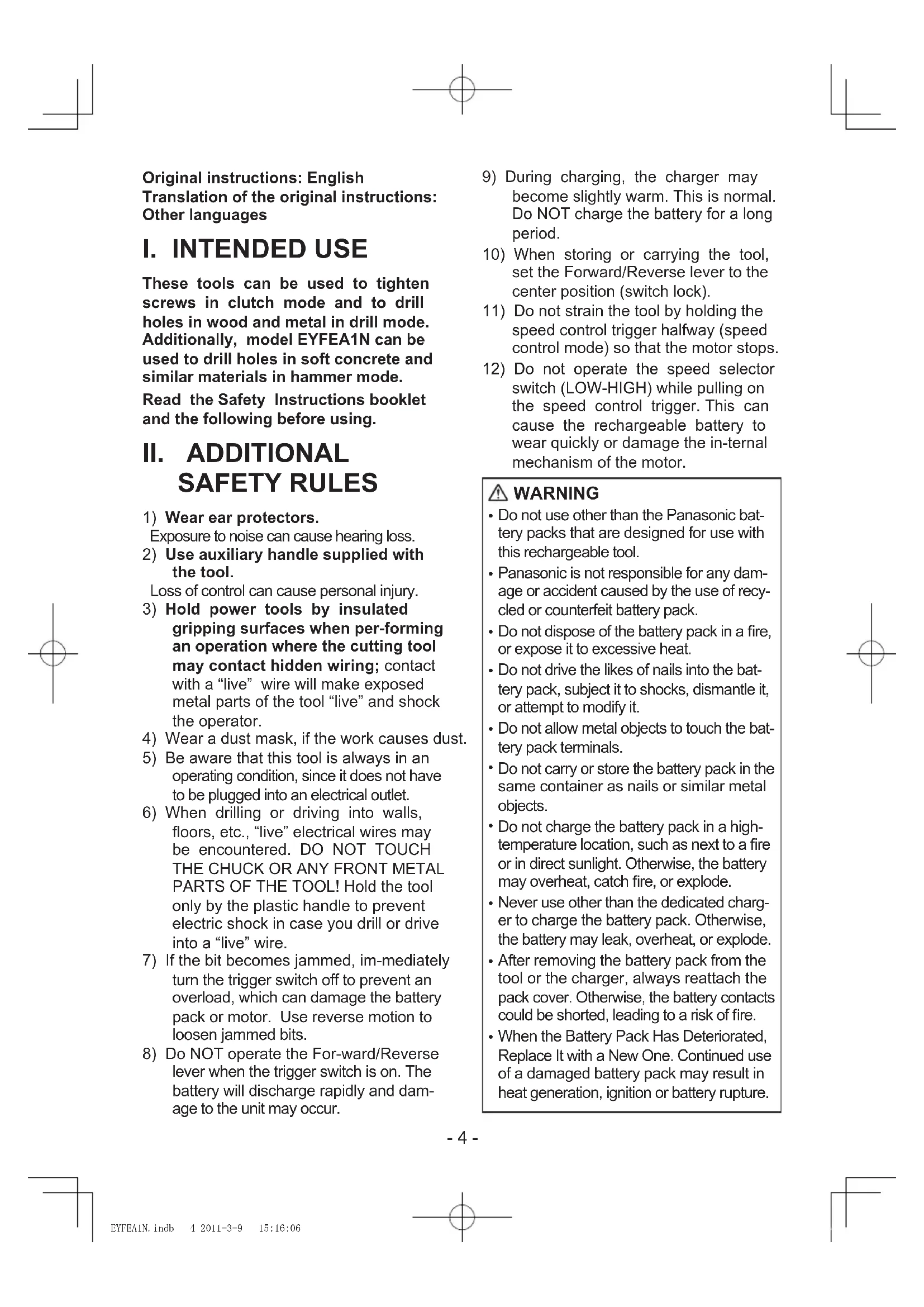sure the work place is well ventilated. Triangle mark Graduation selection mark EYFEA1N.indb 8 2011-3-9 15:16:08- 9 - When the battery pack is removed from the