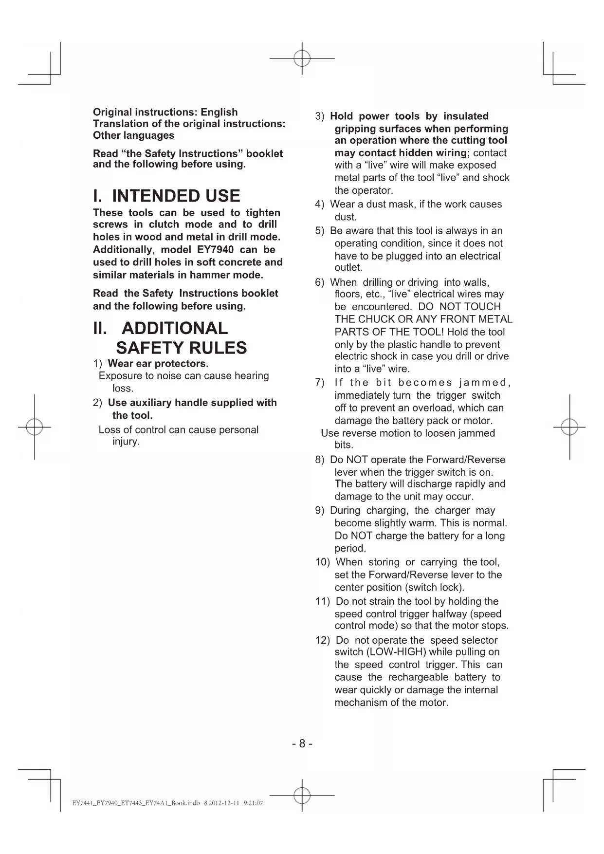 switch (LOW-HIGH) while pulling on the speed control trigger. This can cause the rechargeable battery to wear quickly or damage the internal mechanism of the motor. Original instructions: English Translation of the original instructions: Other languages Read “the Safety Instructions” booklet and the following before using. EY7441_EY7940_EY7443_EY74A1_Book.indb 8 2012-12-11 9:21:07- 9 - WARNING Do not use other than the Panasonic
