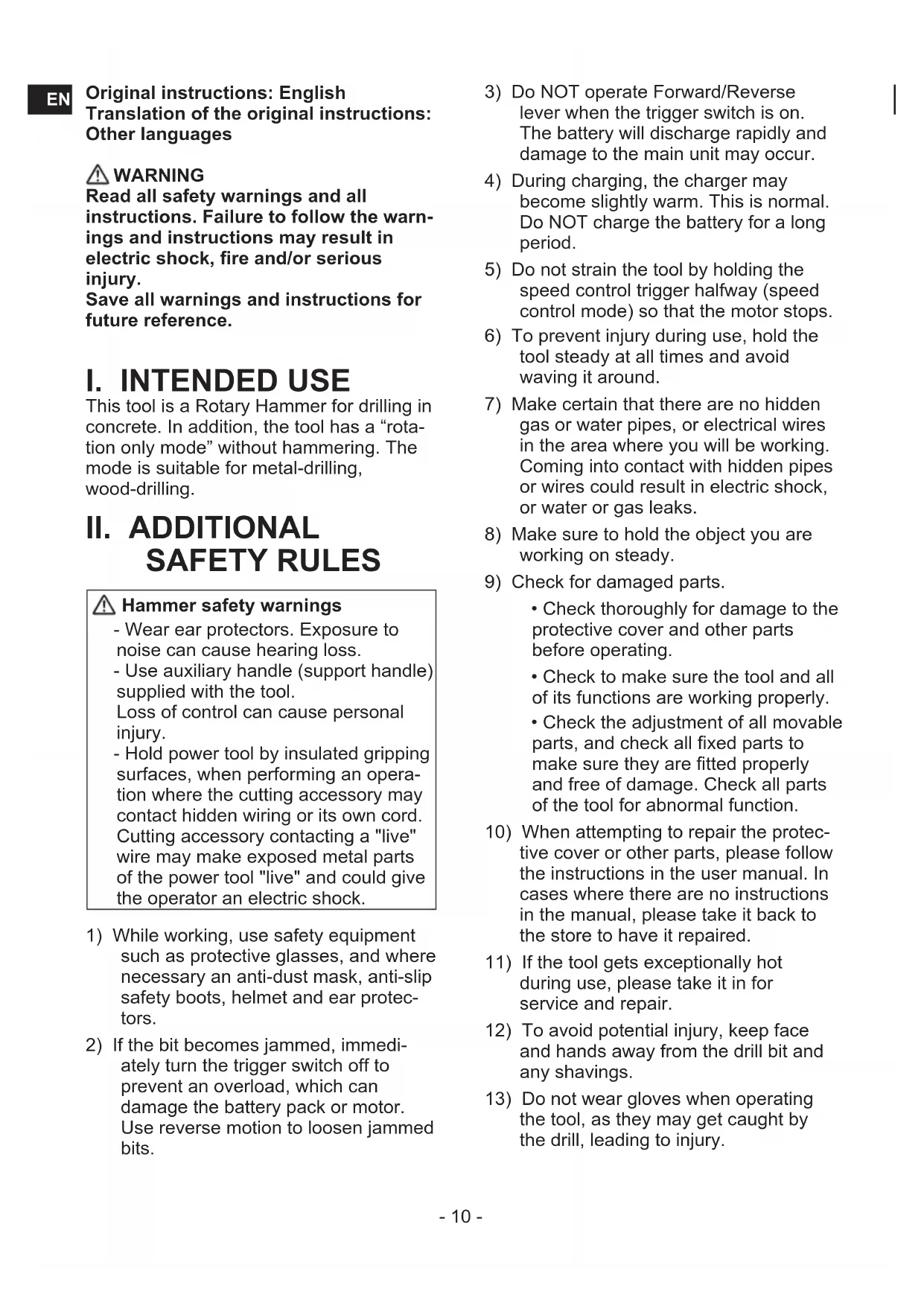 SAFETY RULES Hammer safety warnings - Wear ear protectors. Exposure to noise can cause hearing loss. - Use auxiliary handle (support handle) supplied with the tool. Loss of control can cause personal injury. - Hold power tool by insulated gripping surfaces, when performing an opera- tion where the cutting accessory may contact hidden wiring or its own cord. Cutting accessory contacting a "live" wire may make exposed metal parts of the power tool "live" and could give the operator an electric shock.