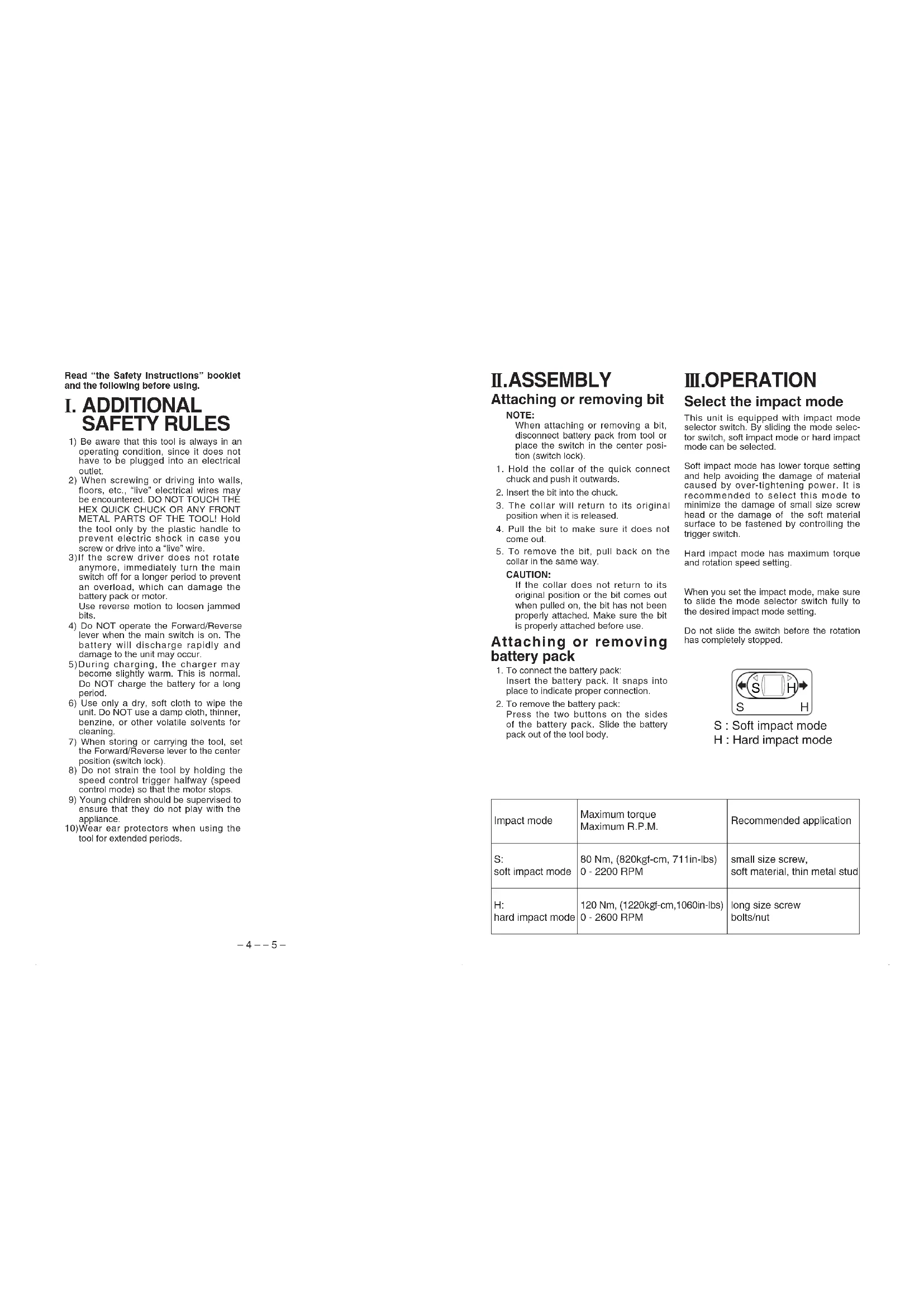 | S: soft impact mode | 80 Nm, (820kgf-cm, 711in-lbs) 0 - 2200 RPM | small size screw, soft material, thin metal stud |
