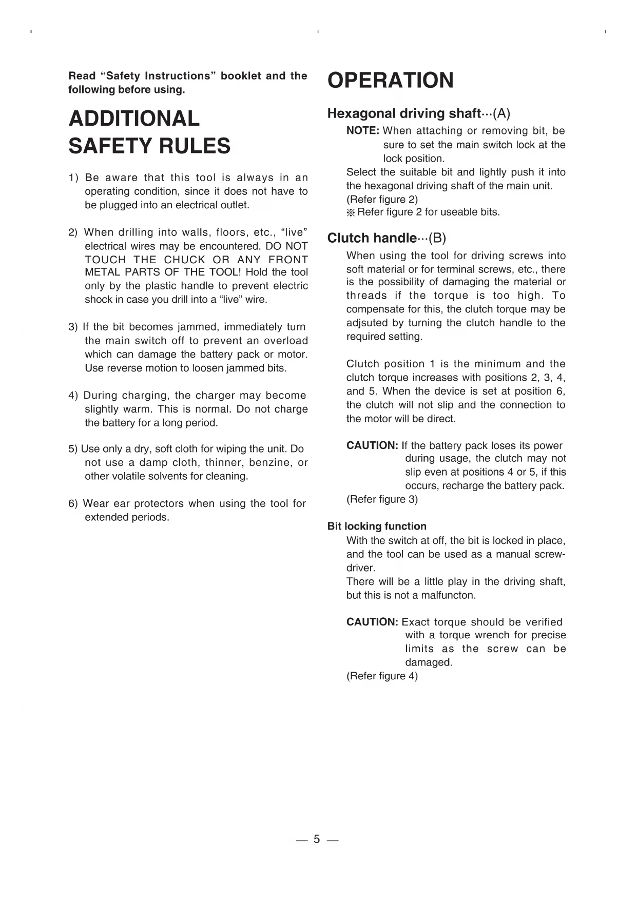 extended periods. OPERATION Hexagonal driving shaft···(A) NOTE: When attaching or removing bit, be sure to set the main switch lock at the lock position. Select the suitable bit and lightly push it into the hexagonal driving shaft of the main unit. (Refer figure 2)