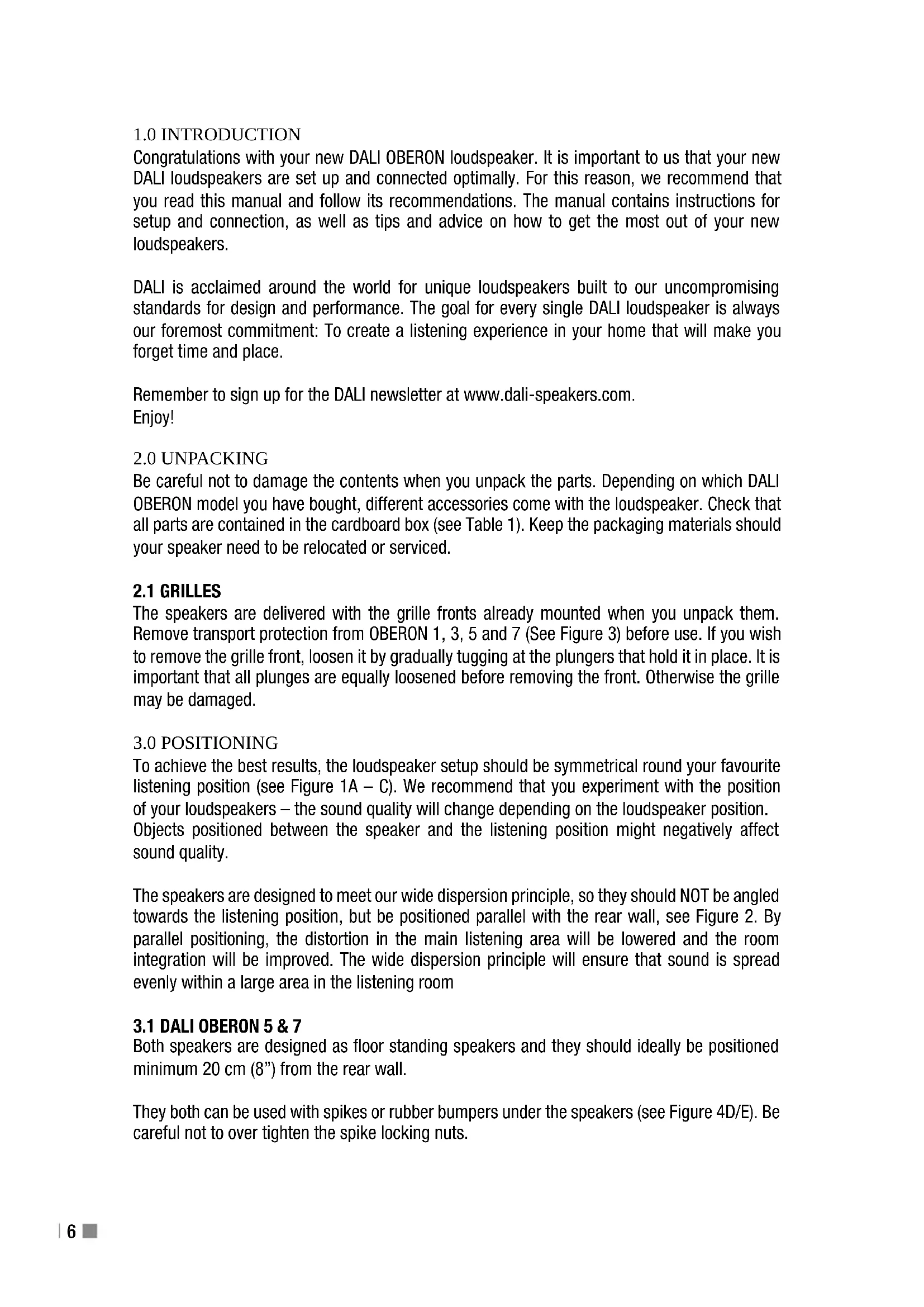 Congratulations with your new DALI OBERON loudspeaker. It is important to us that your new DALI loudspeakers are set up and connected optimally. For this reason, we recommend that you read this manual and follow its recommendations. The manual contains instructions for setup and connection, as well as tips and advice on how to get the most out of your new loudspeakers. DALI is acclaimed around the world for unique loudspeakers built to our uncompromising standards for design and performance. The goal for every single DALI loudspeaker is always our foremost commitment: To create a listening experience in your home that will make you forget time and place. Remember to sign up for the DALI newsletter at www.dali-speakers.com. Enjoy!