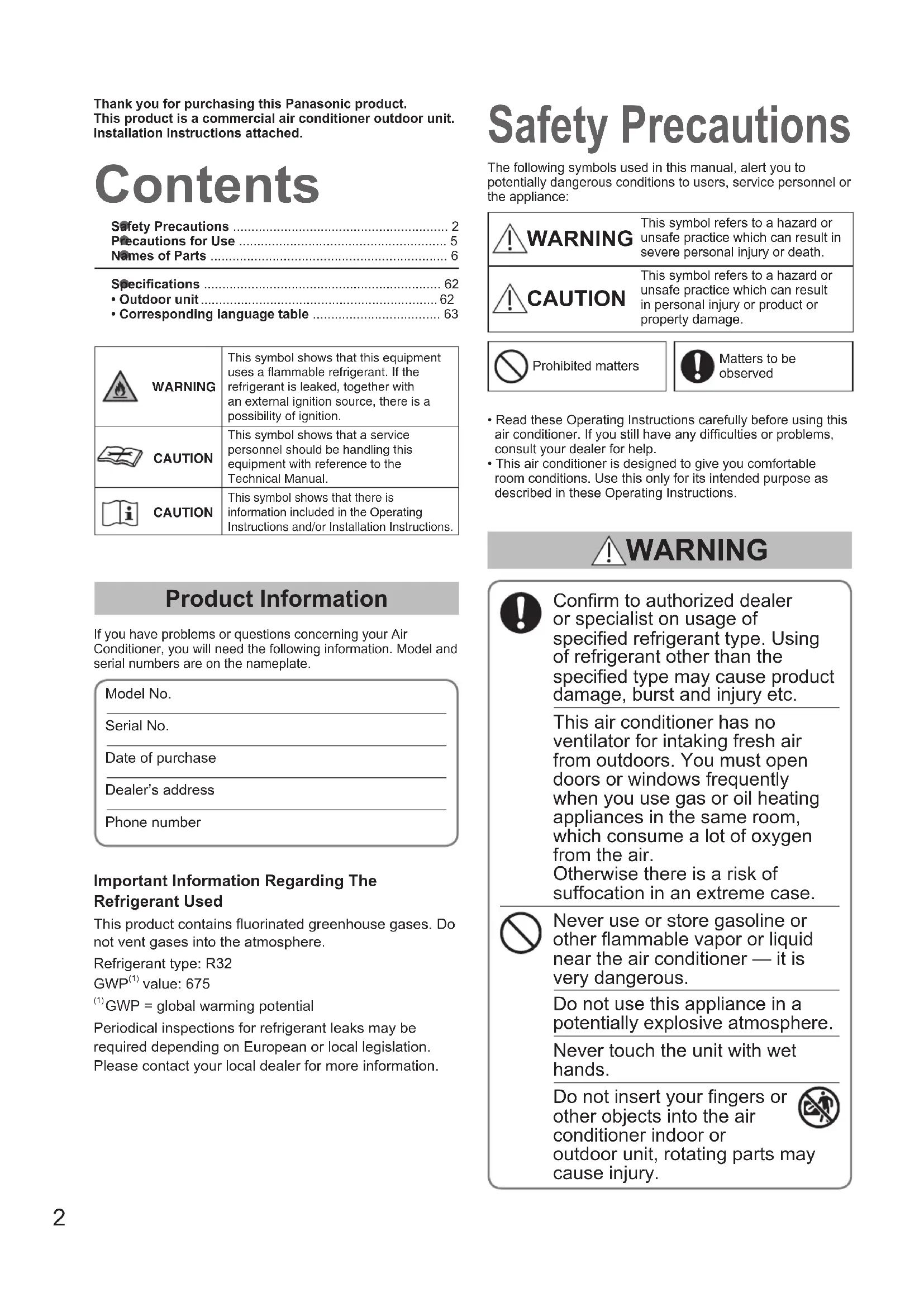 - Corresponding language table ................................... 63 Contents Thank you for purchasing this Panasonic product.This product is a commercial air conditioner outdoor unit.Installation Instructions attached. Product Information If you have problems or questions concerning your Air Conditioner, you will need the following information. Model and serial numbers are on the nameplate.Model No. Serial No. Date of purchaseDealer’s addressPhone number Safety Precautions The following symbols used in this manual, alert you to potentially dangerous conditions to users, service personnel or the appliance: WARNING This symbol refers to a hazard or unsafe practice which can result in severe personal injury or death. CAUTION This symbol refers to a hazard or unsafe practice which can result in personal injury or product or property damage.Prohibited mattersMatters to be observed• Read these Operating Instructions carefully before using this air conditioner. If you still have any difculties or problems, consult your dealer for help.• This air conditioner is designed to give you comfortable room conditions. Use this only for its intended purpose as described in these Operating Instructions. Conrm to authorized dealer or specialist on usage of specied refrigerant type. Using of refrigerant other than the specied type may cause product damage, burst and injury etc. This air conditioner has no ventilator for intaking fresh air from outdoors. You must open doors or windows frequently when you use gas or oil heating appliances in the same room, which consume a lot of oxygen from the air. Otherwise there is a risk of suffocation in an extreme case. Never use or store gasoline or other ammable vapor or liquid near the air conditioner — it is very dangerous. Do not use this appliance in a potentially explosive atmosphere. Never touch the unit with wet hands. Do not insert your ngers or other objects into the air conditioner indoor or outdoor unit, rotating parts may cause injury. WARNING WARNINGThis symbol shows that this equipment uses a flammable refrigerant. If the refrigerant is leaked, together with an external ignition source, there is a possibility of ignition.CAUTIONThis symbol shows that a service personnel should be handling this equipment with reference to the Technical Manual.CAUTIONThis symbol shows that there is information included in the Operating Instructions and/or Installation Instructions.Important Information Regarding The Refrigerant UsedThis product contains uorinated greenhouse gases. Do not vent gases into the atmosphere.Refrigerant type: R32 GWP (1) value: 675 (1) GWP = global warming potentialPeriodical inspections for refrigerant leaks may be required depending on European or local legislation. Please contact your local dealer for more information. OI_00_302355_all.indb 2 2018/9/20 10:01:243 ENGLISH If the refrigerant comes in contact with a ame, it produces a toxic gas. For safety, be sure to turn the air conditioner off and also to disconnect the power before cleaning or servicing. Pull off the power plug from a receptacle, or switch off the breaker, or switch off the power disconnecting mean to isolate the air conditioner from the main power supply in case of emergency. Dispose of according to national and/or local legislation. This product must not be modied or disassembled under any circumstances. Modied or disassembled unit may cause re, electric shock or injury. Do not clean inside the indoor and outdoor units by users. Engage authorized dealer or specialist for cleaning. In case of malfunction of this appliance, do not repair by yourself. Contact to the sales dealer or service dealer for a repair and disposal. Provide a power outlet to be used exclusively for each unit, and a power supply disconnect, Earth Leakage Circuit Breaker (ELCB) or Residual Current Device (RCD) for overcurrent protection should be provided in the exclusive line. Provide a power outlet exclusively for each unit, and full disconnection means having a contact separation in all poles must be incorporated in the xed wiring in accordance with the wiring rules. To prevent possible hazards from insulation failure, the unit must be grounded. The appliance shall be stored in a room without continuously operating ignition sources (for example: open ames, an operating gas appliance or an operating electric heater). Be aware that refrigerants may not contain an odour. An unventilated area where the appliance using ammable refrigerants is installed shall be so constructed that should any refrigerant leak, it will not stagnate so as to create a re or explosion hazard. The appliance shall be stored in a well-ventilated area where the room size corresponds to the room area as specied for operation. After the unit is installed, never fail to ask the installer for the oor space of the room where the unit is installed and the refrigerant charge amount. In case the unit or the room divider is changed, never fail to consult the sales dealer or service dealer. Do not use means to accelerate the defrosting process or to clean, other than those recommended by the manufacturer. Do not pierce or burn. In cases that require mechanical ventilation, ventilation openings shall be kept clear of obstruction. WARNING Do not use modied cord, joint cord, extension cord or unspecied cord to prevent overheating and re. OI_00_302355_all.indb 3 2018/9/20 10:01:244 WARNING Stop using the product when any abnormality/failure occurs and disconnect the power plug or turn off the power switch and breaker. (Risk of smoke/re/electric shock) Examples of abnormality/failure: