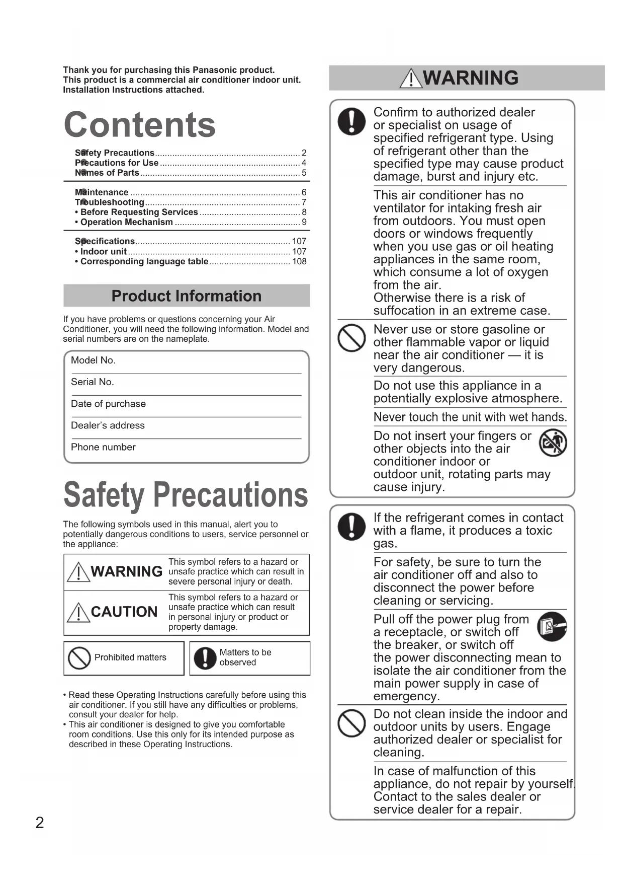 - Corresponding language table ................................. 108 Contents Thank you for purchasing this Panasonic product.This product is a commercial air conditioner indoor unit.Installation Instructions attached. Safety Precautions Product Information If you have problems or questions concerning your Air Conditioner, you will need the following information. Model and serial numbers are on the nameplate.Model No. Serial No. Date of purchaseDealer’s addressPhone number Conrm to authorized dealer or specialist on usage of specied refrigerant type. Using of refrigerant other than the specied type may cause product damage, burst and injury etc. This air conditioner has no ventilator for intaking fresh air from outdoors. You must open doors or windows frequently when you use gas or oil heating appliances in the same room, which consume a lot of oxygen from the air. Otherwise there is a risk of suffocation in an extreme case. Never use or store gasoline or other ammable vapor or liquid near the air conditioner — it is very dangerous. Do not use this appliance in a potentially explosive atmosphere. Never touch the unit with wet hands. Do not insert your ngers or other objects into the air conditioner indoor or outdoor unit, rotating parts may cause injury. If the refrigerant comes in contact with a ame, it produces a toxic gas. For safety, be sure to turn the air conditioner off and also to disconnect the power before cleaning or servicing. Pull off the power plug from a receptacle, or switch off the breaker, or switch off the power disconnecting mean to isolate the air conditioner from the main power supply in case of emergency. Do not clean inside the indoor and outdoor units by users. Engage authorized dealer or specialist for cleaning. In case of malfunction of this appliance, do not repair by yourself. Contact to the sales dealer or service dealer for a repair. The following symbols used in this manual, alert you to potentially dangerous conditions to users, service personnel or the appliance: WARNING This symbol refers to a hazard or unsafe practice which can result in severe personal injury or death. CAUTION This symbol refers to a hazard or unsafe practice which can result in personal injury or product or property damage.Prohibited mattersMatters to be observed• Read these Operating Instructions carefully before using this air conditioner. If you still have any difculties or problems, consult your dealer for help.• This air conditioner is designed to give you comfortable room conditions. Use this only for its intended purpose as described in these Operating Instructions. WARNING OI_00_291492_EU.indb 2 2017/6/20 10:47:073 ENGLISH This appliance is intended to be used by expert or trained users in shops, in light industry and on farms, or for commercial use by lay persons. This appliance is not intended for use by persons (including children) with reduced physical, sensory or mental capabilities, or lack of experience and knowledge, unless they have been given supervision or instruction concerning use of the appliance by a person responsible for their safety. Children should be supervised to ensure that they do not play with the appliance. <for European market only> This appliance can be used by children aged from 8 years and above and persons with reduced physical, sensory or mental capabilities or lack of experience and knowledge if they have been given supervision or instruction concerning use of the appliance in a safe way and understand the hazards involved. Children shall not play with the appliance. Cleaning and user maintenance shall not be made by children without supervision. Keep the re alarm and the air outlet at least 1.5m away from the unit. Do not cool or heat the room too much if babies or invalids are present. Do not turn the air conditioner on and off from the power mains switch. Use the ON/OFF operation button. Do not stick anything into the air outlet of the outdoor unit. This is dangerous because the fan is rotating at high speed. Do not touch the air inlet or the sharp aluminum ns of the outdoor unit. You may get injured. Do not stick any object into the FAN CASE. You may be injured and the unit may be damaged. Provide a power outlet to be used exclusively for each unit, and a power supply disconnect, Earth Leakage Circuit Breaker (ELCB) or Residual Current Device (RCD) for overcurrent protection should be provided in the exclusive line. Provide a power outlet exclusively for each unit, and full disconnection means having a contact separation in all poles must be incorporated in the xed wiring in accordance with the wiring rules. To prevent possible hazards from insulation failure, the unit must be grounded. Do not use modied cord, joint cord, extension cord or unspecied cord to prevent overheating and re. Stop using the product when any abnormality/failure occurs and disconnect the power plug or turn off the power switch and breaker. (Risk of smoke/re/electric shock) Examples of abnormality/failure: