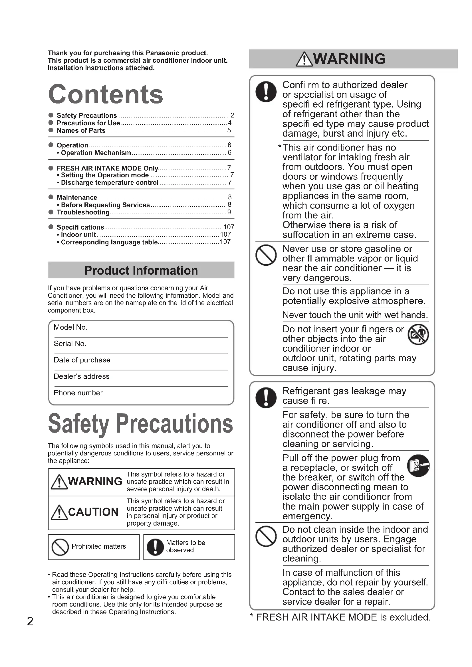 - • Corresponding language table Contents Safety Precautions Product Information If you have problems or questions concerning your Air Conditioner, you will need the following information. Model and serial numbers are on the nameplate on the lid of the electrical component box.Model No. Serial No. Date of purchaseDealer’s addressPhone number Confi rm to authorized dealer or specialist on usage of specifi ed refrigerant type. Using of refrigerant other than the specifi ed type may cause product damage, burst and injury etc. This air conditioner has no ventilator for intaking fresh air from outdoors. You must open doors or windows frequently when you use gas or oil heating appliances in the same room, which consume a lot of oxygen from the air. Otherwise there is a risk of suffocation in an extreme case. Never use or store gasoline or other fl ammable vapor or liquid near the air conditioner — it is very dangerous. Do not use this appliance in a potentially explosive atmosphere. Never touch the unit with wet hands. Do not insert your fi ngers or other objects into the air conditioner indoor or outdoor unit, rotating parts may cause injury. Refrigerant gas leakage may cause fi re. For safety, be sure to turn the air conditioner off and also to disconnect the power before cleaning or servicing. Pull off the power plug from a receptacle, or switch off the breaker, or switch off the power disconnecting mean to isolate the air conditioner from the main power supply in case of emergency. Do not clean inside the indoor and outdoor units by users. Engage authorized dealer or specialist for cleaning. In case of malfunction of this appliance, do not repair by yourself. Contact to the sales dealer or service dealer for a repair. The following symbols used in this manual, alert you to potentially dangerous conditions to users, service personnel or the appliance: WARNING This symbol refers to a hazard or unsafe practice which can result in severe personal injury or death. CAUTION This symbol refers to a hazard or unsafe practice which can result in personal injury or product or property damage.Prohibited mattersMatters to be observedThank you for purchasing this Panasonic product.This product is a commercial air conditioner indoor unit.Installation Instructions attached.• Read these Operating Instructions carefully before using this air conditioner. If you still have any diffi culties or problems, consult your dealer for help.• This air conditioner is designed to give you comfortable room conditions. Use this only for its intended purpose as described in these Operating Instructions. WARNING p. 107