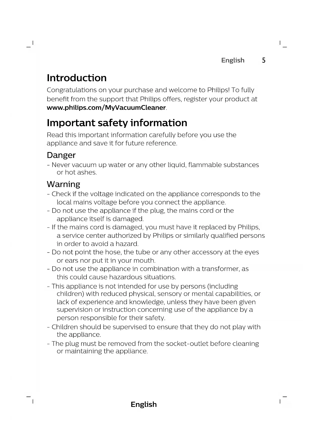 English Introduction Congratulations on your purchase and welcome to Philips! To fully benefit from the support that Philips offers, register your product at www.philips.com/MyVacuumCleaner. Important safety information Read this important information carefully before you use the appliance and save it for future reference. Danger - Never vacuum up water or any other liquid, flammable substances or hot ashes. Warning - Check if the voltage indicated on the appliance corresponds to the local mains voltage before you connect the appliance. - Do not use the appliance if the plug, the mains cord or the appliance itself is damaged. - If the mains cord is damaged, you must have it replaced by Philips, a service center authorized by Philips or similarly qualified persons in order to avoid a hazard. - Do not point the hose, the tube or any other accessory at the eyes or ears nor put it in your mouth. - Do not use the appliance in combination with a transformer, as this could cause hazardous situations. - This appliance is not intended for use by persons (including children) with reduced physical, sensory or mental capabilities, or lack of experience and knowledge, unless they have been given supervision or instruction concerning use of the appliance by a person responsible for their safety. - Children should be supervised to ensure that they do not play with the appliance. - The plug must be removed from the socket-outlet before cleaning or maintaining the appliance.6 English - This vacuum cleaner is designed for household use only. Do not use this vacuum cleaner to vacuum up building waste, cement dust, ashes, fine sand, lime and similar substances. Never use the vacuum cleaner without any of the filters. This could damage the motor and shorten the life of the vacuum cleaner. Always clean all parts of the vacuum cleaner as shown in the user manual. Do not clean any parts with water and/or cleaning agents if this is not specifically shown in the user manual. Caution - Never use the appliance without any of the filters. This could damage the motor and shorten the life of the appliance. - Always clean all parts as shown in the user manual. Do not clean any parts with water and/or cleaning agents if this is not particularly shown in the user manual. - If you clean a washable filter with water, make sure it is completely dry before you put it back into the appliance. Do not dry the filter in direct sunlight, on a radiator or in a tumble dryer. Replace a washable filter if it can no longer be cleaned properly or if it is damaged. - To guarantee optimal dust retention and performance of the vacuum cleaner, always replace the filters with original Philips filters of the correct type (see 'Ordering accessories'). - Maximum noise level: Lc = 84 dB(A) Electromagnetic fields (EMF) This Philips appliance complies with all applicable standards and regulations regarding exposure to electromagnetic fields. Ordering accessories To buy accessories or spare parts, visit www.philips.com/parts-and- accessories or go to your Philips dealer. You can also contact the Philips Consumer Care Center in your country (see the international warranty leaflet for contact details). Warranty and support If you need information or support, please visit www.philips.com/support or read the international warranty leaflet.7 English Recycling - Do not throw away the product with the normal household waste at the end of its life, but hand it in at an official collection point for recycling. By doing this, you help to preserve the environment. - Follow your country's rules for the separate collection of electrical and electronic products. Correct disposal helps prevent negative consequences for the environment and human health. Troubleshooting This chapter summarizes the most common problems you could encounter with the appliance. If you are unable to solve the problem with the information below, visit www.philips.com/support for a list of frequently asked questions or contact the Consumer Care Center in your country. Problem Possible cause Solution The suction power is insufficient. The dust container is full. Empty the dust container. The filters are dirty. Clean or replace the filters. The suction power is set to a low setting. Increase the suction power with the regulator on the appliance or on the handgrip. The nozzle, tube or hose is blocked up. To remove the obstruction, disconnect the blocked-up item and connect it (as far as possible) the other way around. Switch on the vacuum cleaner to force the air through the blocked-up item in opposite direction.8 English Problem Possible cause Solution When I use my vacuum cleaner I sometimes feel electric shocks. Your vacuum cleaner builds up static electricity. The lower the air humidity, the more static electricity the appliance builds up. Discharge the appliance by frequently holding the tube against other metal objects in the room (for example the legs of a table or chair, a radiator etc.). You can also raise the air humidity level in the room.Bahasa Melayu