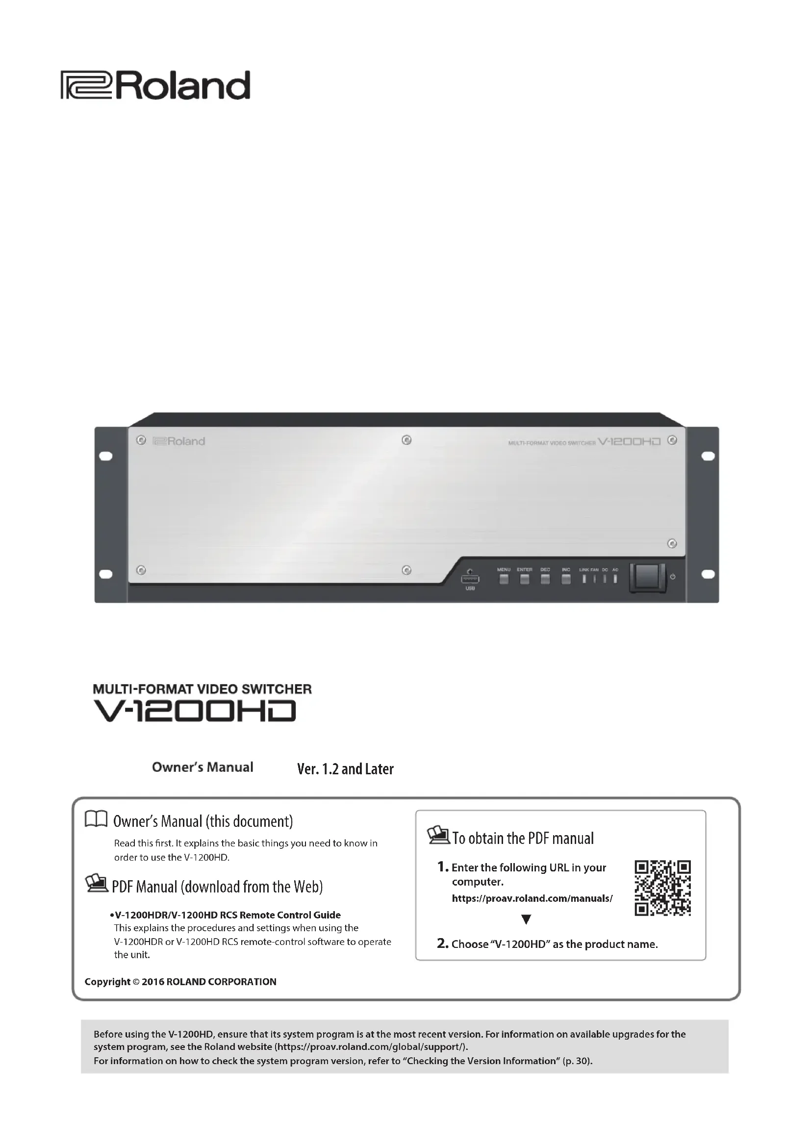 Before using the V-1200HD, ensure that its system program is at the most recent version. For information on available upgrades for the system program, see the Roland website (https://proav.roland.com/global/support/). For information on how to check the system program version, refer to “Checking the Version Information” (p. 30). Ver. 1.2 and Later2 CAUTION RISK OF ELECTRIC SHOCKDO NOT OPENATTENTION: RISQUE DE CHOC ELECTRIQUE NE PAS OUVRIRCAUTION: TO REDUCE THE RISK OF ELECTRIC SHOCK,DO NOT REMOVE COVER (OR BACK).NO USER-SERVICEABLE PARTS INSIDE.REFER SERVICING TO QUALIFIED SERVICE PERSONNEL.The lightning flash with arrowhead symbol, within an equilateral triangle, is intended to alert the user to the presence of uninsulated “dangerous voltage” within the product’s enclosure that may be of sufficient magnitude to constitute a risk of electric shock to persons.The exclamation point within an equilateral triangle is intended to alert the user to the presence of important operating and maintenance (servicing) instructions in the literature accompanying the product. INSTRUCTIONS PERTAINING TO A RISK OF FIRE, ELECTRIC SHOCK, OR INJURY TO PERSONS.