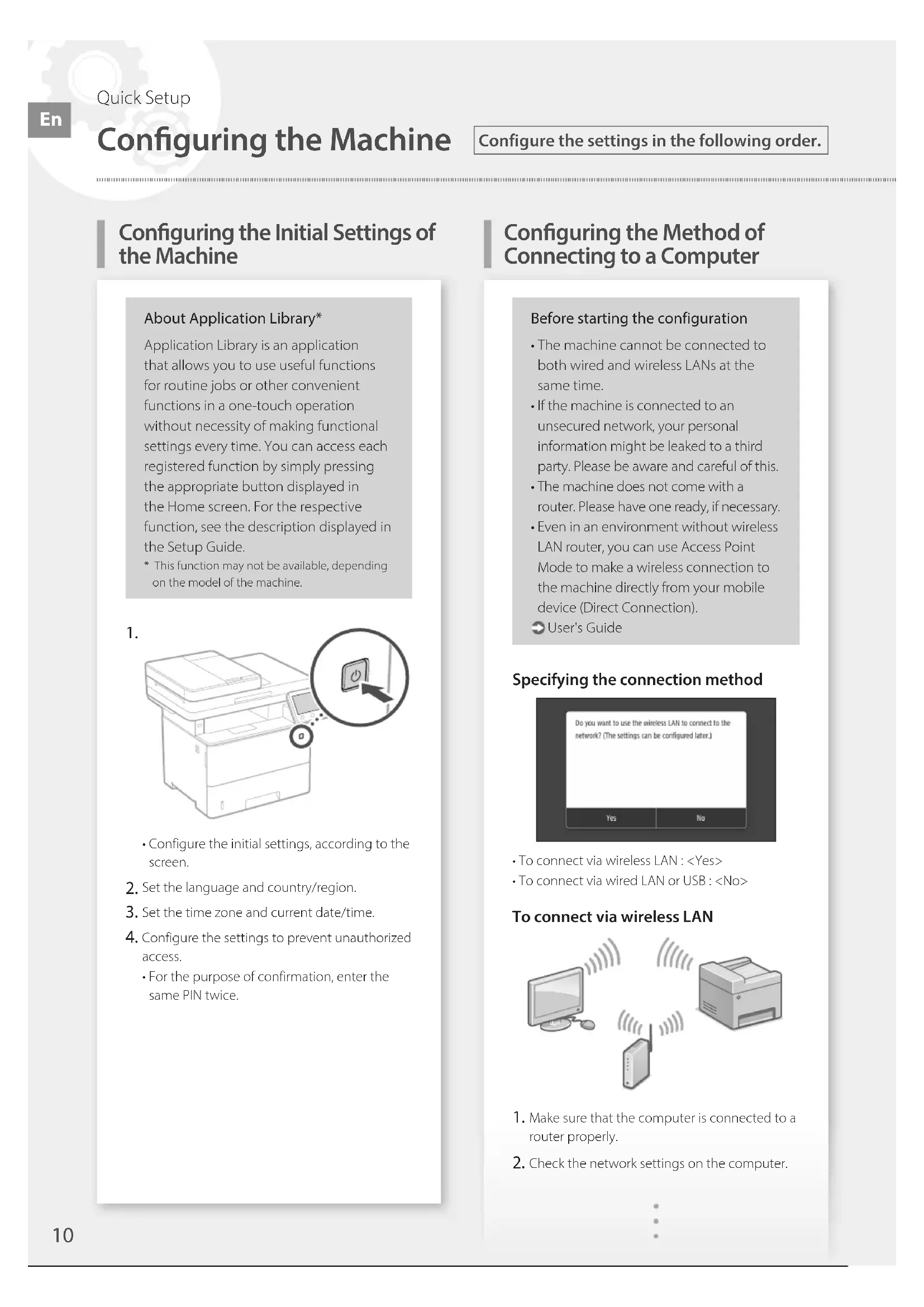- Configure the initial settings, according to the screen. Set the language and country/region. Set the time zone and current date/time. Configure the settings to prevent unauthorized access.• For the purpose of confirmation, enter the same PIN twice.Before starting the configuration• The machine cannot be connected to both wired and wireless LANs at the same time.• If the machine is connected to an unsecured network, your personal information might be leaked to a third party. Please be aware and careful of this.• The machine does not come with a router. Please have one ready, if necessary.• Even in an environment without wireless LAN router, you can use Access Point Mode to make a wireless connection to the machine directly from your mobile device (Direct Connection). User's GuideSpecifying the connection method• To connect via wireless LAN : <Yes>• To connect via wired LAN or USB : <No>To connect via wireless LAN Make sure that the computer is connected to a router properly. Check the network settings on the computer.