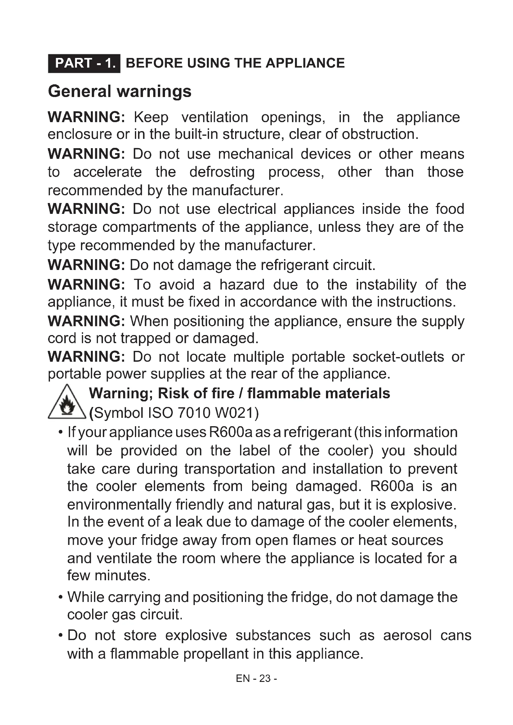 - If your appliance uses R600a as a refrigerant (this information will be provided on the label of the cooler) you should take care during transportation and installation to prevent the cooler elements from being damaged. R600a is an environmentally friendly and natural gas, but it is explosive. In the event of a leak due to damage of the cooler elements, move your fridge away from open ames or heat sources and ventilate the room where the appliance is located for a few minutes.