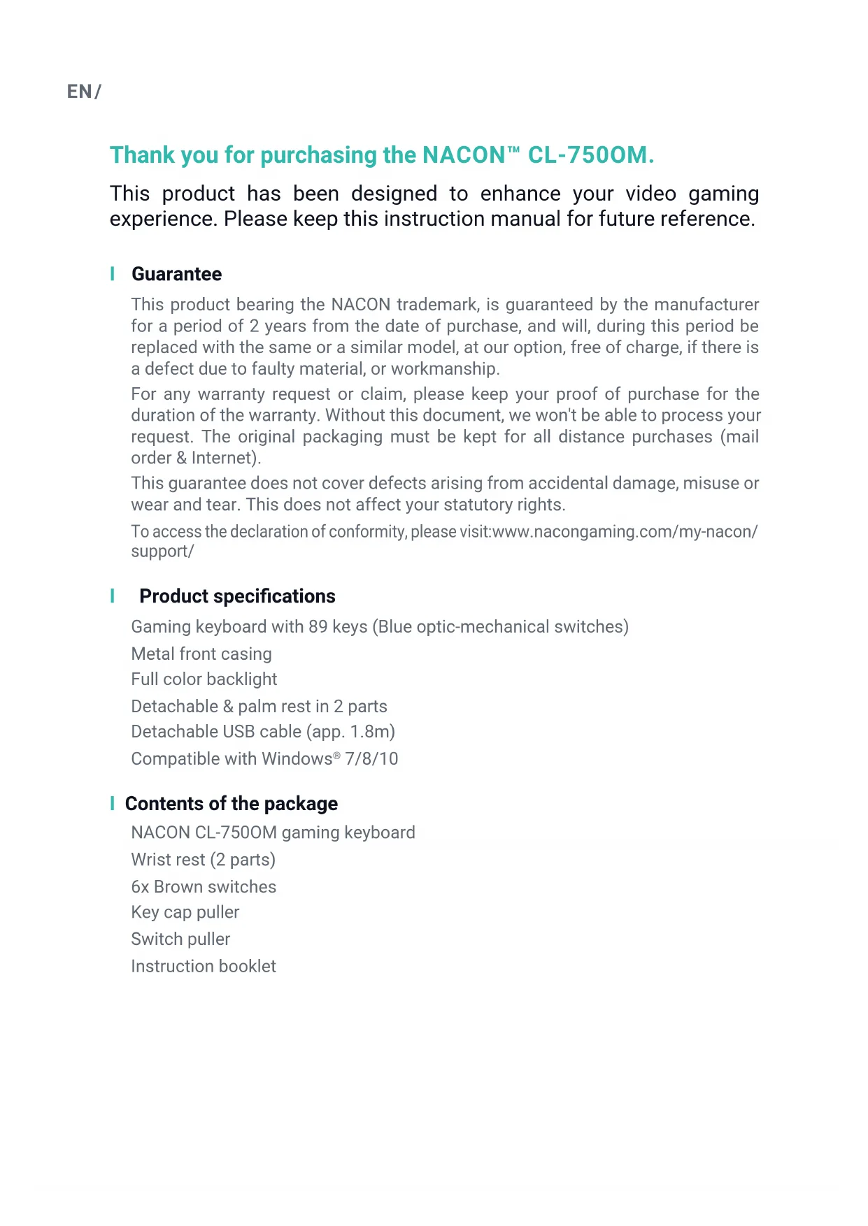 GAMING KEYBOARD11.06.20NACON, 396 - 466 Rue de la VoyetteCRT2 59273 FRETIN, FRANCE User gUide NACON is a registered trademark. Compatible WINDOWS ®EN / Thank you for purchasing the NACON™ CL-750OM. This product has been designed to enhance your video gaming experience. Please keep this instruction manual for future reference. I Guarantee This product bearing the NACON trademark, is guaranteed by the manufacturer for a period of 2 years from the date of purchase, and will, during this period be replaced with the same or a similar model, at our option, free of charge, if there is a defect due to faulty material, or workmanship. For any warranty request or claim, please keep your proof of purchase for the duration of the warranty. Without this document, we won't be able to process your request. The original packaging must be kept for all distance purchases (mail order & Internet). This guarantee does not cover defects arising from accidental damage, misuse or wear and tear. This does not affect your statutory rights. To access the declaration of conformity, please visit: www.nacongaming.com/my-nacon/ support/ I Productspecications Gaming keyboard with 89 keys (Blue optic-mechanical switches) Metal front casing Full color backlight Detachable & palm rest in 2 parts Detachable USB cable (app. 1.8m) Compatible with Windows