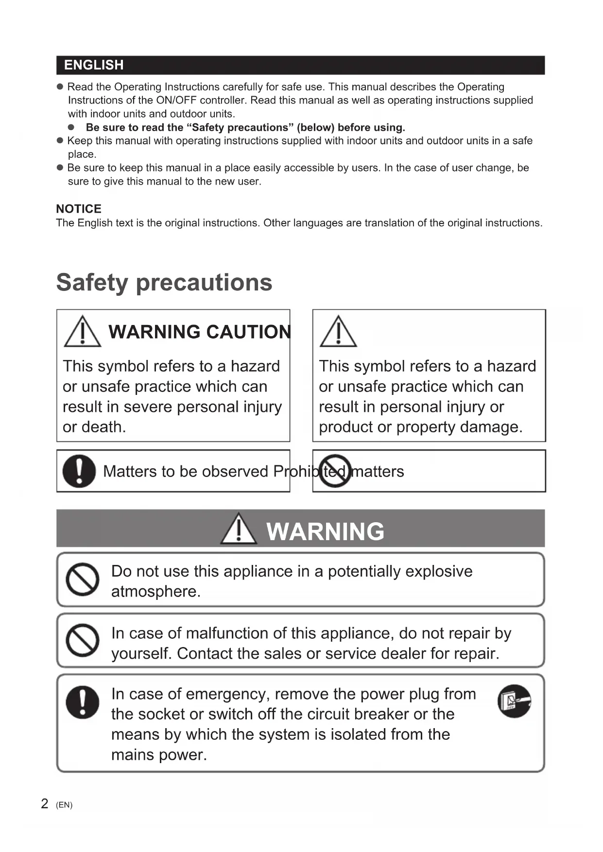 Instrukcja obsługiSterownik ON/OFF Przed uruchomieniem urządzenia należy dokładnie przeczytać instrukcję obsługi i zachować ją do wykorzystania w przyszłości. POLSKI Инструкция по эксплуатацииЦентральный пульт управления Вкл/ВыклПеред использованием этого устройства внимательно прочитайте настоящую инструкцию по эксплуатации и сохраните ее для дальнейших справок. Інструкція з використанняПульт Вкл/ВиклПерш ніж використовувати цей пристрій, уважно прочитайте цю інструкцію з використання. Збережіть її, щоб звертатися до неї в майбутньому. CZ-ANC3_ACXF55-19832.indd 1 2021/09/28 10:43:442 (EN) ENGLISH z Read the Operating Instructions carefully for safe use. This manual describes the Operating Instructions of the ON/OFF controller. Read this manual as well as operating instructions supplied with indoor units and outdoor units. z Be sure to read the “Safety precautions” (below) before using. z Keep this manual with operating instructions supplied with indoor units and outdoor units in a safe place. z Be sure to keep this manual in a place easily accessible by users. In the case of user change, be sure to give this manual to the new user. NOTICE The English text is the original instructions. Other languages are translation of the original instructions. Safety precautions WARNING CAUTION This symbol refers to a hazard or unsafe practice which can result in severe personal injury or death. This symbol refers to a hazard or unsafe practice which can result in personal injury or product or property damage. Matters to be observed Prohibited matters WARNING Do not use this appliance in a potentially explosive atmosphere. In case of malfunction of this appliance, do not repair by yourself. Contact the sales or service dealer for repair. In case of emergency, remove the power plug from the socket or switch off the circuit breaker or the means by which the system is isolated from the mains power. CZ-ANC3_ACXF55-19832.indd 2 2021/09/28 10:43:453 (EN) CAUTION This appliance is not intended for use by persons (including children) with reduced physical, sensory or mental capabilities, or lack of experience and knowledge, unless they have been given supervision or instruction concerning use of the appliance by a person responsible for their safety. Children should be supervised to ensure that they do not play with the appliance. <for European market only> This appliance can be used by children aged from 8 years and above and persons with reduced physical, sensory or mental capabilities or lack of experience and knowledge if they have been given supervision or instruction concerning use of the appliance in a safe way and understand the hazards involved. Children shall not play with the appliance. Cleaning and user maintenance shall not be made by children without supervision. y Do not operate with wet hands. y Do not wash with water. Disposal of Old Equipment Only for European Union and countries with recycling systems This symbol on the products, packaging, and/or accompanying documents means that used electrical and electronic products must not be mixed with general household waste. For proper treatment, recovery and recycling of old products, please take them to applicable collection points in accordance with your national legislation. By disposing of them correctly, you will help to save valuable resources and prevent any potential negative effects on human health and the environment. For more information about collection and recycling, please contact your local municipality. Penalties may be applicable for incorrect disposal of this waste, in accordance with national legislation. ENGLISH CZ-ANC3_ACXF55-19832.indd 3 2021/09/28 10:43:454 (EN) Note y This device complies with Part 15 of the FCC Rules. Operation is subject to the following two conditions: (1) This device may not cause harmful interference, and (2) this device must accept any interference received, including interference that may cause undesired operation. y This equipment has been tested and found to comply with the limits for a Class B digital device, pursuant to Part 15 of the FCC Rules. These limits are designed to provide reasonable protection against harmful interference in a residential installation. This equipment generates, uses and can radiate radio frequency energy and, if not installed and used in accordance with the instructions, may cause harmful interference to radio communications. However, there is no guarantee that interference will not occur in a particular installation. If this equipment does cause harmful interference to radio or television reception, which can be determined by turning the equipment off and on, the user is encouraged to try to correct the interference by one or more of the following measures: