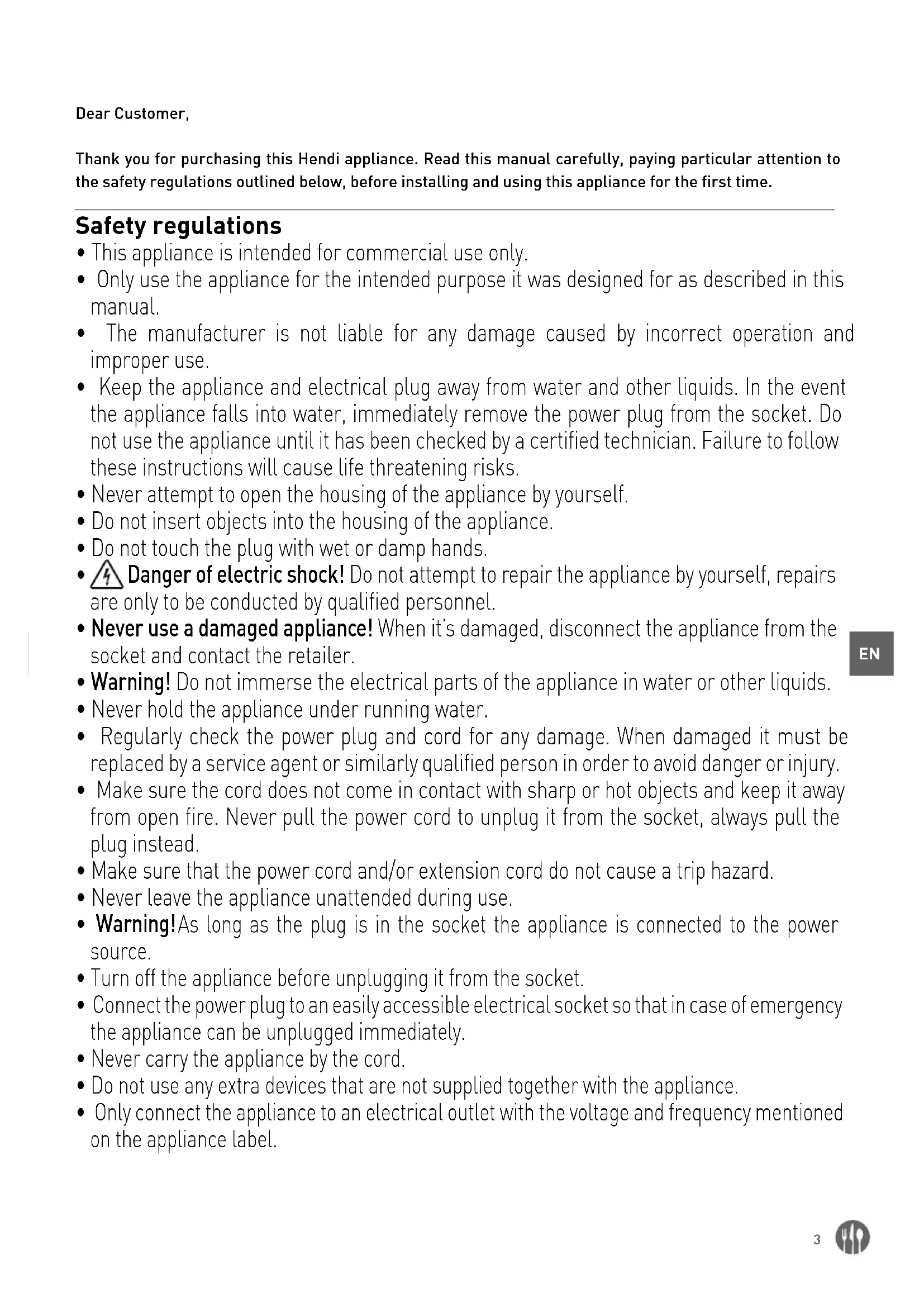 Dear Customer, Thank you for purchasing this Hendi appliance. Read this manual carefully, paying particular attention to the safety regulations outlined below, before installing and using this appliance for the first time. Safety regulations