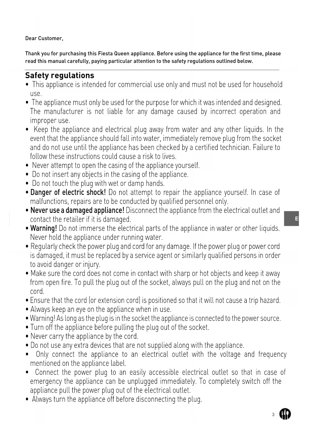 - This appliance is intended only for frying appropriate food such as donut, fries, etc in commercial use. Any other use may lead to damage of the appliance or personal injury.