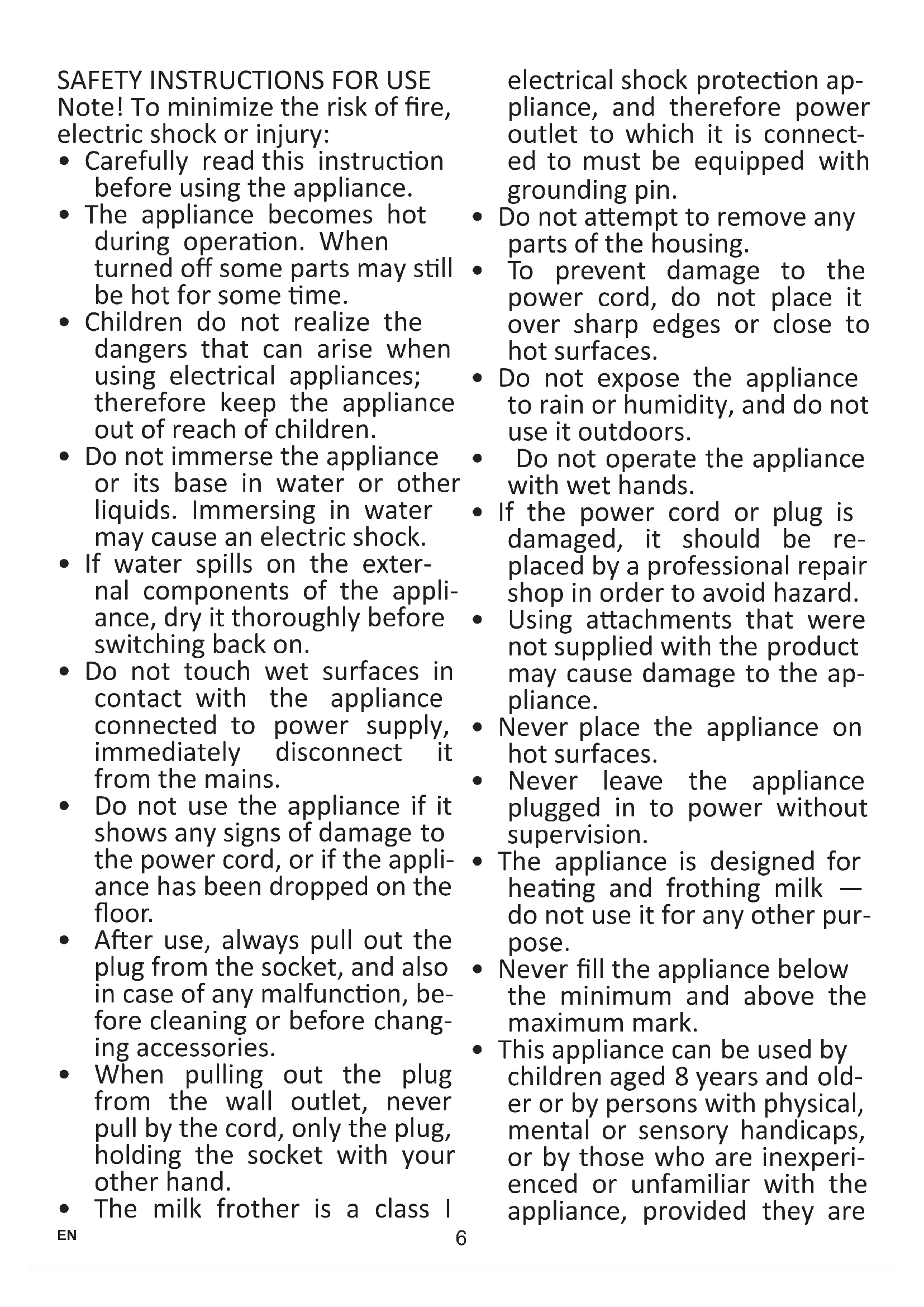 - The milk frother is a class I electrical shock protecon ap- pliance, and therefore power outlet to which it is connect- ed to must be equipped with grounding pin.