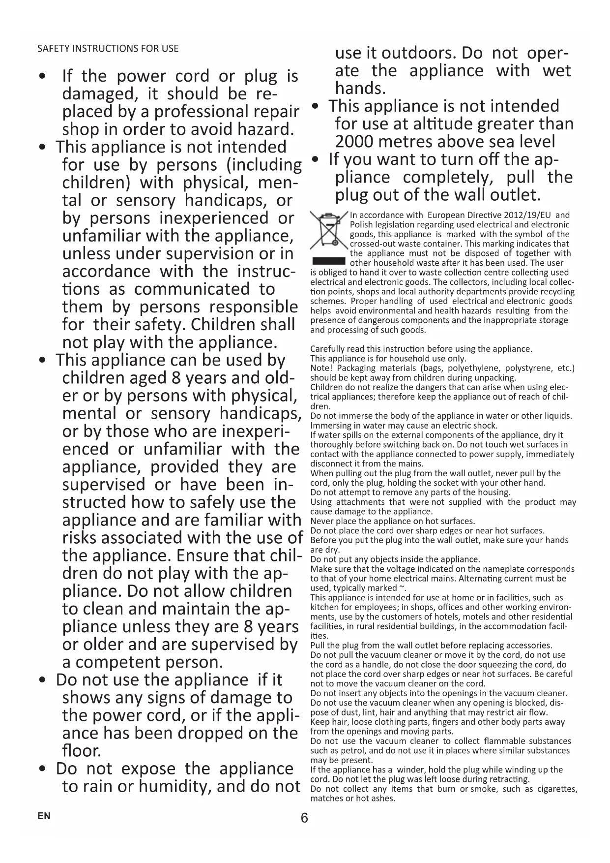 - If you want to turn o the ap- pliance completely, pull the plug out of the wall outlet. In accordance with European Direcve 2012/19/EU and Polish legislaon regarding used electrical and electronic goods, this appliance is marked with the symbol of the crossedout waste container. This marking indicates that the appliance must not be disposed of together with other household waste aer it has been used. The user is obliged to hand it over to waste collecon centre collecng used electrical and electronic goods. The collectors, including local collec- on points, shops and local authority departments provide recycling schemes. Proper handling of used electrical and electronic goods helps avoid environmental and health hazards resulng from the presence of dangerous components and the inappropriate storage and processing of such goods. Carefully read this instrucon before using the appliance. This appliance is for household use only. Note! Packaging materials (bags, polyethylene, polystyrene, etc.) should be kept away from children during unpacking. Children do not realize the dangers that can arise when using elec- trical appliances; therefore keep the appliance out of reach of chil- dren. Do not immerse the body of the appliance in water or other liquids. Immersing in water may cause an electric shock. If water spills on the external components of the appliance, dry it thoroughly before switching back on. Do not touch wet surfaces in contact with the appliance connected to power supply, immediately disconnect it from the mains. When pulling out the plug from the wall outlet, never pull by the cord, only the plug, holding the socket with your other hand. Do not aempt to remove any parts of the housing. Using aachments that were not supplied with the product may cause damage to the appliance. Never place the appliance on hot surfaces. Do not place the cord over sharp edges or near hot surfaces. Before you put the plug into the wall outlet, make sure your hands are dry. Do not put any objects inside the appliance. Make sure that the voltage indicated on the nameplate corresponds to that of your home electrical mains. Alternang current must be used, typically marked ~. This appliance is intended for use at home or in facilies, such as kitchen for employees; in shops, oces and other working environ- ments, use by the customers of hotels, motels and other residenal facilies, in rural residenal buildings, in the accommodaon facil- ies. Pull the plug from the wall outlet before replacing accessories. Do not pull the vacuum cleaner or move it by the cord, do not use the cord as a handle, do not close the door squeezing the cord, do not place the cord over sharp edges or near hot surfaces. Be careful not to move the vacuum cleaner on the cord. Do not insert any objects into the openings in the vacuum cleaner. Do not use the vacuum cleaner when any opening is blocked, dis- pose of dust, lint, hair and anything that may restrict air ow. Keep hair, loose clothing parts, ngers and other body parts away from the openings and moving parts. Do not use the vacuum cleaner to collect ammable substances such as petrol, and do not use it in places where similar substances may be present. If the appliance has a winder, hold the plug while winding up the cord. Do not let the plug was le loose during retracng. Do not collect any items that burn or smoke, such as cigarees, matches or hot ashes. EN7