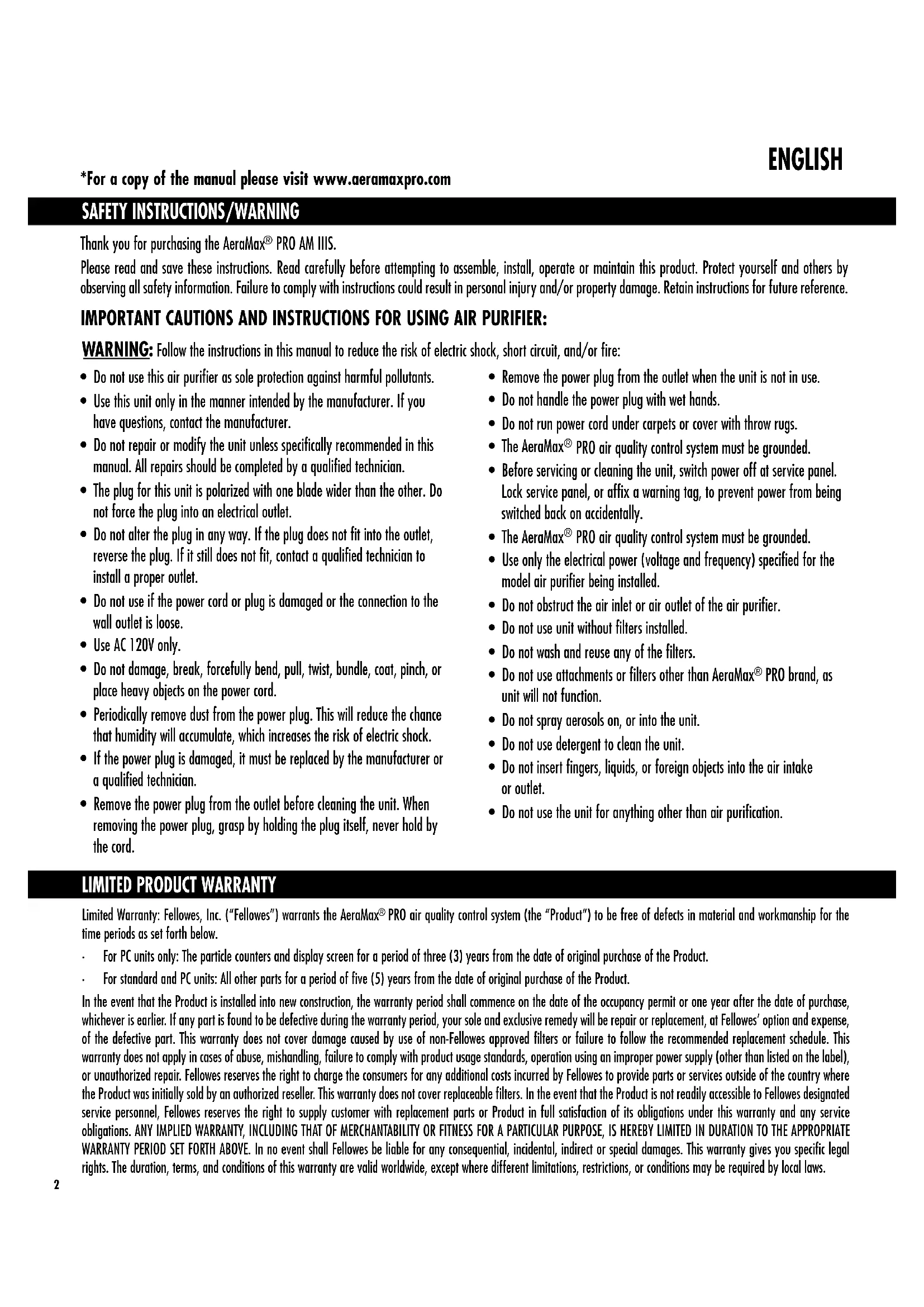 *For a copy of the manual please visit www.aeramaxpro.com Limited Warranty: Fellowes, Inc. (“Fellowes”) warrants the AeraMax PRO air quality control system (the “Product”) to be free of defects in material and workmanship for the time periods as set forth below.