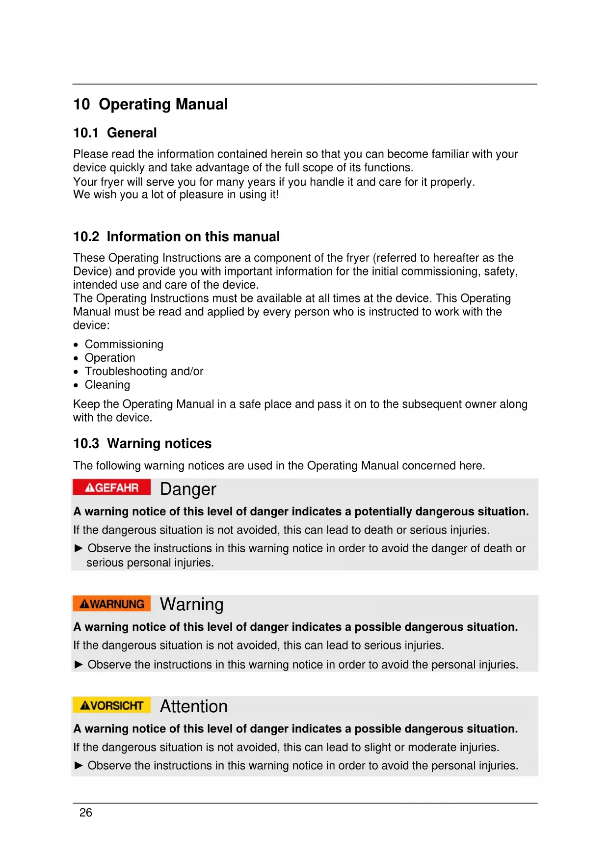 These Operating Instructions are a component of the fryer (referred to hereafter as the Device) and provide you with important information for the initial commissioning, safety, intended use and care of the device. The Operating Instructions must be available at all times at the device. This Operating Manual must be read and applied by every person who is instructed to work with the device: