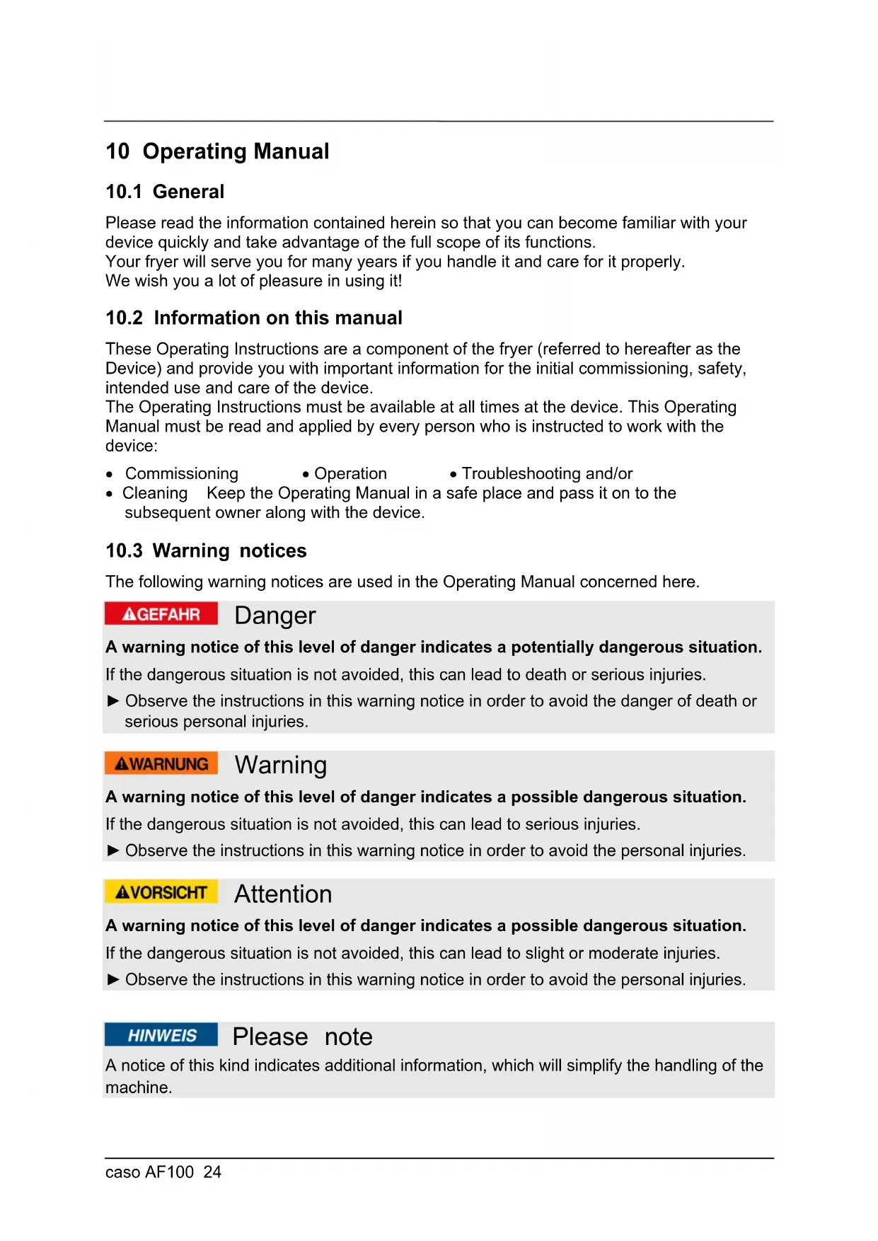 The following warning notices are used in the Operating Manual concerned here. Danger A warning notice of this level of danger indicates a potentially dangerous situation. If the dangerous situation is not avoided, this can lead to death or serious injuries. ► Observe the instructions in this warning notice in order to avoid the danger of death or serious personal injuries. Warning A warning notice of this level of danger indicates a possible dangerous situation. If the dangerous situation is not avoided, this can lead to serious injuries. ► Observe the instructions in this warning notice in order to avoid the personal injuries. Attention A warning notice of this level of danger indicates a possible dangerous situation. If the dangerous situation is not avoided, this can lead to slight or moderate injuries. ► Observe the instructions in this warning notice in order to avoid the personal injuries. Please note A notice of this kind indicates additional information, which will simplify the handling of the machine.caso AF100 25