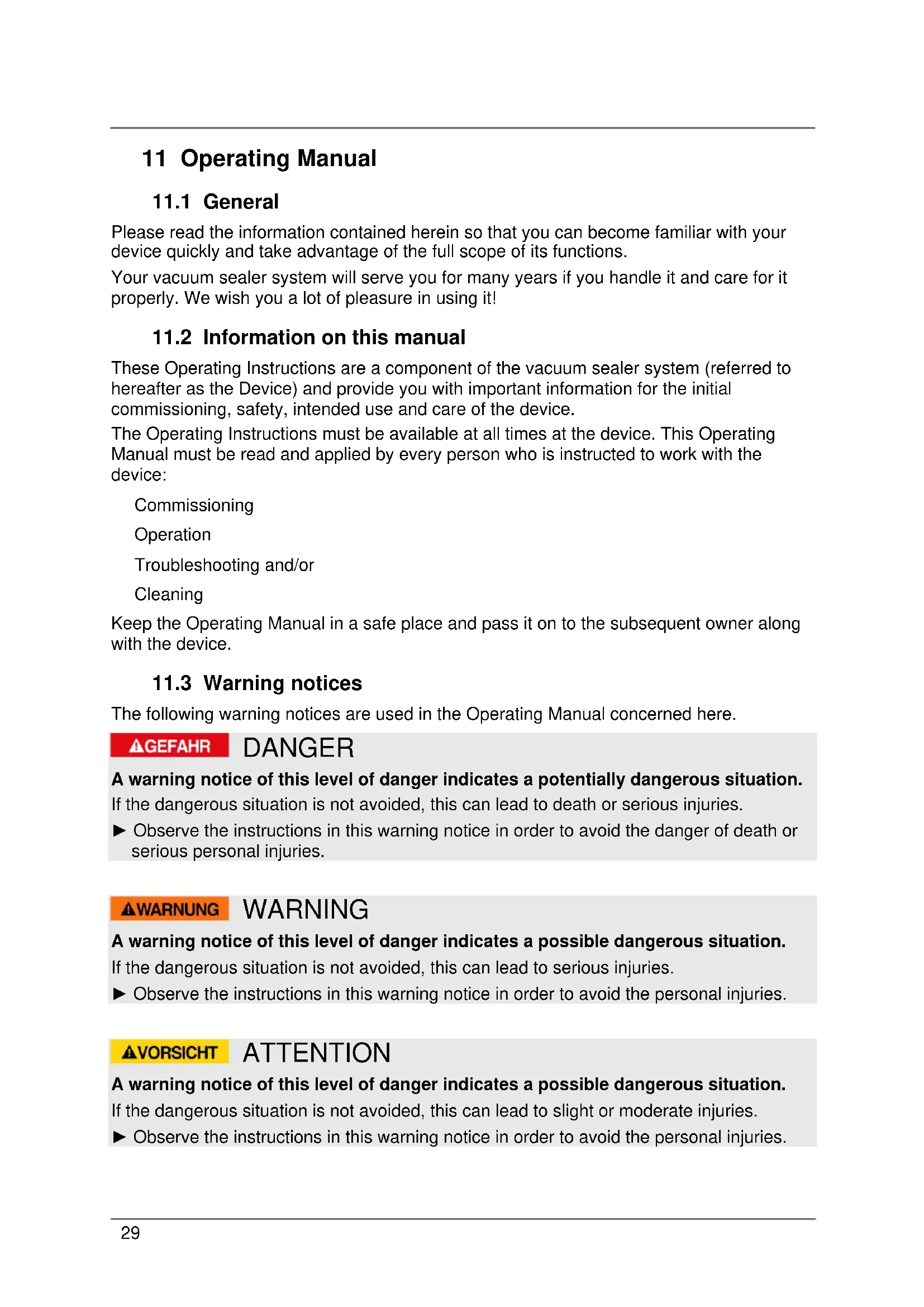 These Operating Instructions are a component of the vacuum sealer system (referred to hereafter as the Device) and provide you with important information for the initial commissioning, safety, intended use and care of the device. The Operating Instructions must be available at all times at the device. This Operating Manual must be read and applied by every person who is instructed to work with the device: Commissioning Operation Troubleshooting and/or Cleaning Keep the Operating Manual in a safe place and pass it on to the subsequent owner along with the device.