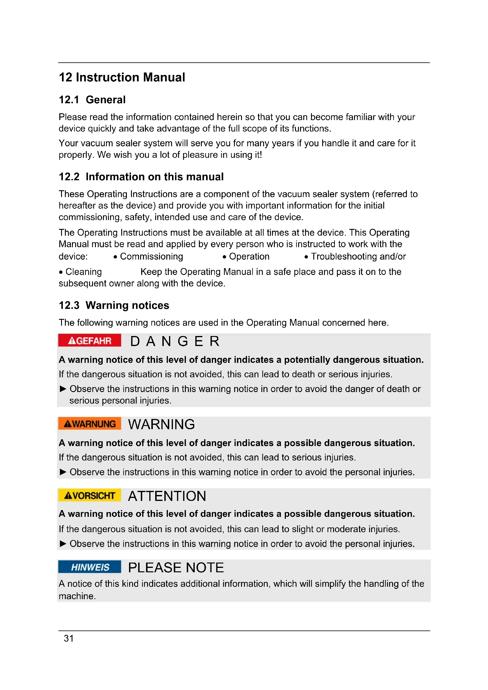 These Operating Instructions are a component of the vacuum sealer system (referred to hereafter as the device) and provide you with important information for the initial commissioning, safety, intended use and care of the device. The Operating Instructions must be available at all times at the device. This Operating Manual must be read and applied by every person who is instructed to work with the device: Commissioning Operation Troubleshooting and/or Cleaning Keep the Operating Manual in a safe place and pass it on to the subsequent owner along with the device.