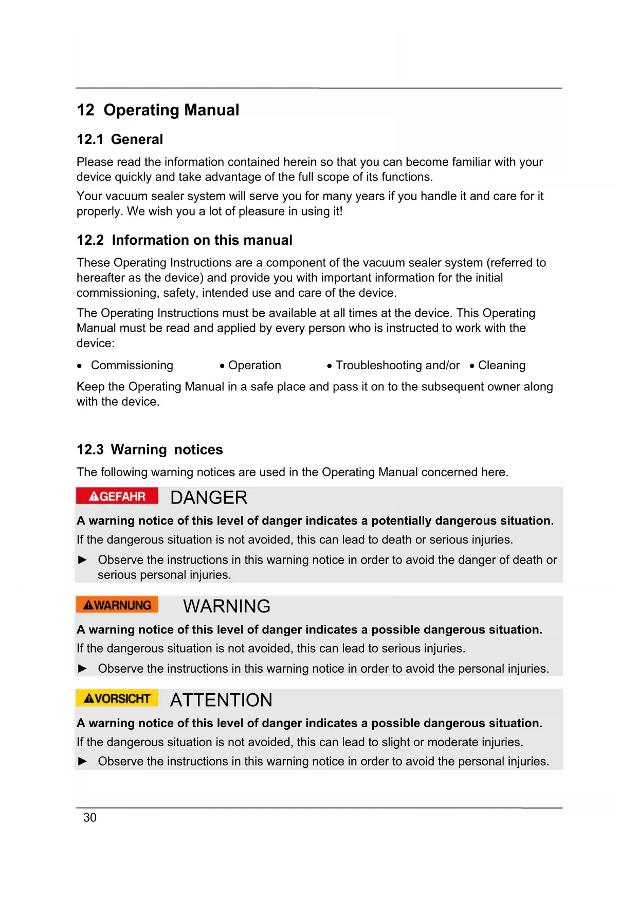 These Operating Instructions are a component of the vacuum sealer system (referred to hereafter as the device) and provide you with important information for the initial commissioning, safety, intended use and care of the device. The Operating Instructions must be available at all times at the device. This Operating Manual must be read and applied by every person who is instructed to work with the device: Commissioning Operation Troubleshooting and/or Cleaning Keep the Operating Manual in a safe place and pass it on to the subsequent owner along with the device.