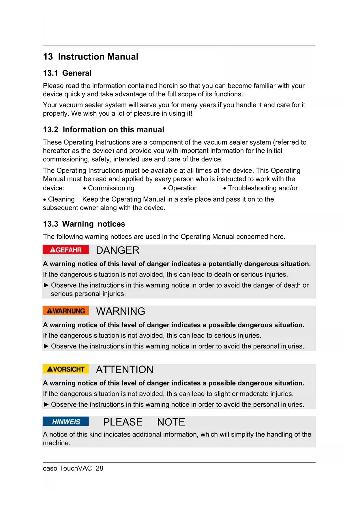 The following warning notices are used in the Operating Manual concerned here. DANGER A warning notice of this level of danger indicates a potentially dangerous situation. If the dangerous situation is not avoided, this can lead to death or serious injuries. ► Observe the instructions in this warning notice in order to avoid the danger of death or serious personal injuries. WARNING A warning notice of this level of danger indicates a possible dangerous situation. If the dangerous situation is not avoided, this can lead to serious injuries. ► Observe the instructions in this warning notice in order to avoid the personal injuries. ATTENTION A warning notice of this level of danger indicates a possible dangerous situation. If the dangerous situation is not avoided, this can lead to slight or moderate injuries. ► Observe the instructions in this warning notice in order to avoid the personal injuries. PLEASE NOTE A notice of this kind indicates additional information, which will simplify the handling of the machine.caso TouchVAC 29