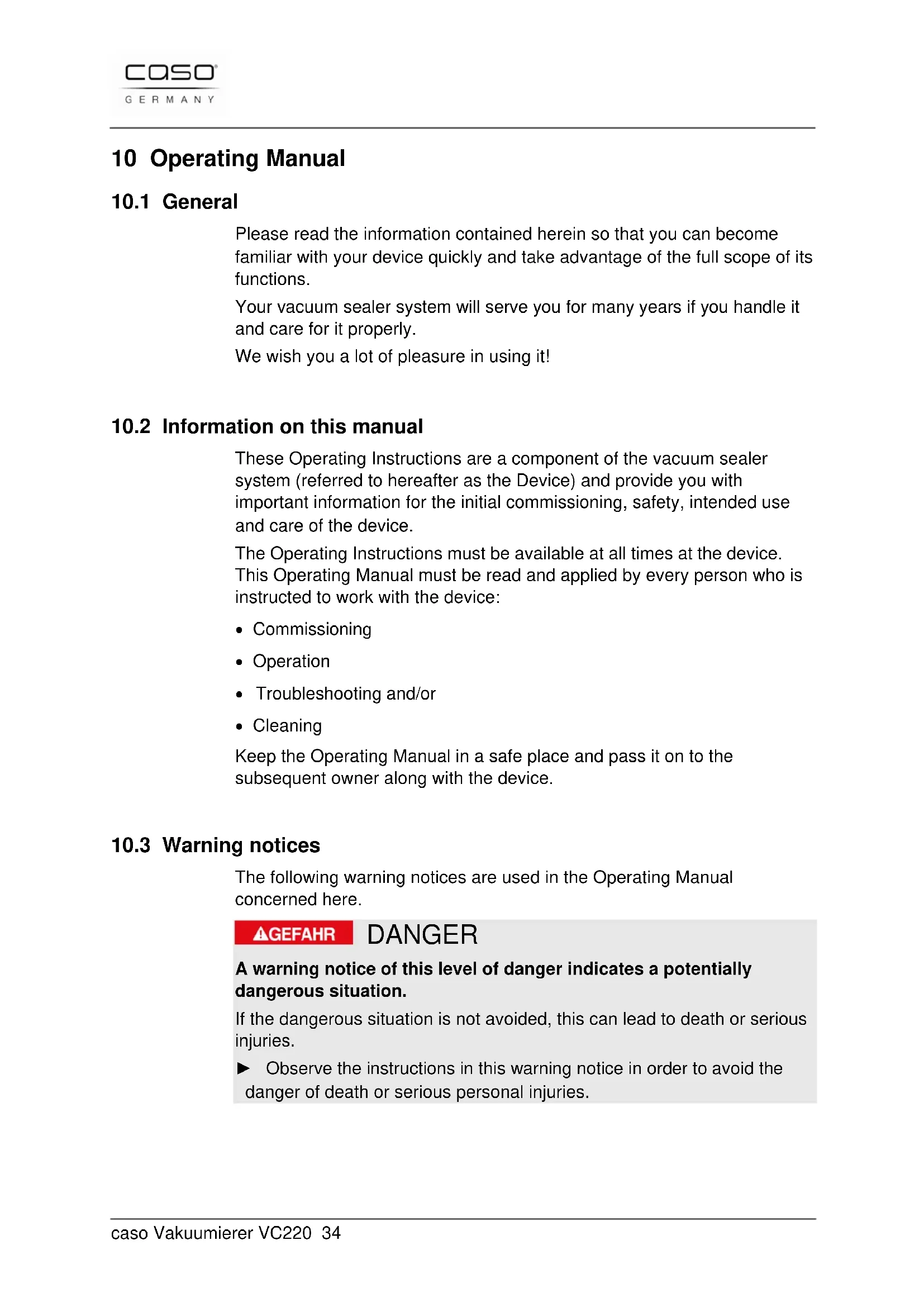 Download the instructions for your Vacuum packaging machines in PDF format for free! Find your manual VC220 - CASO and take your electronic device back in hand. On this page are published all the documents necessary for the use of your device. VC220 by CASO.