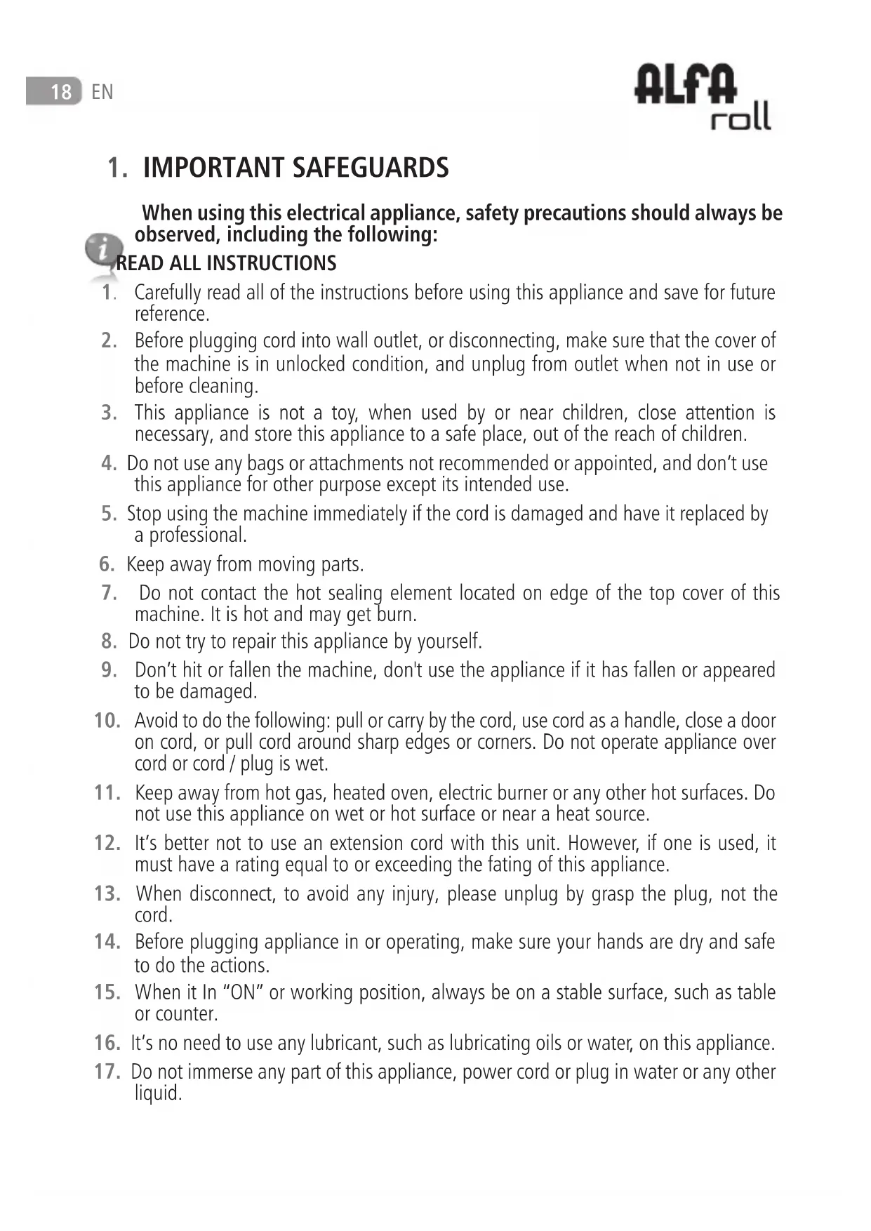 Download the instructions for your Vacuum packaging machines in PDF format for free! Find your manual Roll - ALFA and take your electronic device back in hand. On this page are published all the documents necessary for the use of your device. Roll by ALFA.