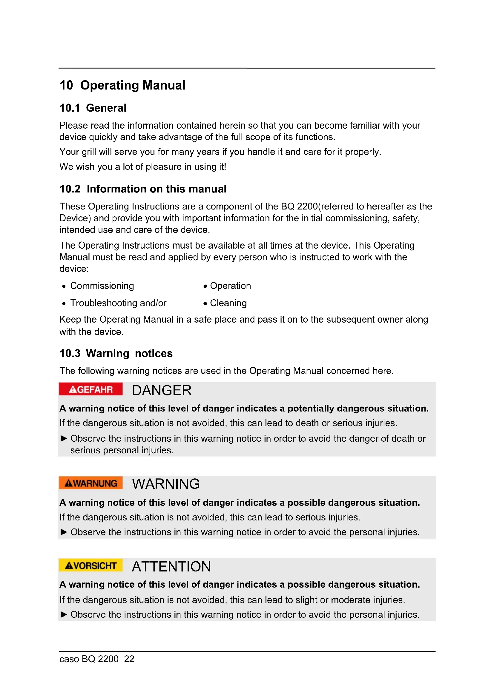 The following warning notices are used in the Operating Manual concerned here. DANGER A warning notice of this level of danger indicates a potentially dangerous situation. If the dangerous situation is not avoided, this can lead to death or serious injuries. ► Observe the instructions in this warning notice in order to avoid the danger of death or serious personal injuries. WARNING A warning notice of this level of danger indicates a possible dangerous situation. If the dangerous situation is not avoided, this can lead to serious injuries. ► Observe the instructions in this warning notice in order to avoid the personal injuries. ATTENTION A warning notice of this level of danger indicates a possible dangerous situation. If the dangerous situation is not avoided, this can lead to slight or moderate injuries. ► Observe the instructions in this warning notice in order to avoid the personal injuries.caso BQ 2200 23 PLEASE NOTE A notice of this kind indicates additional information, which will simplify the handling of the machine.